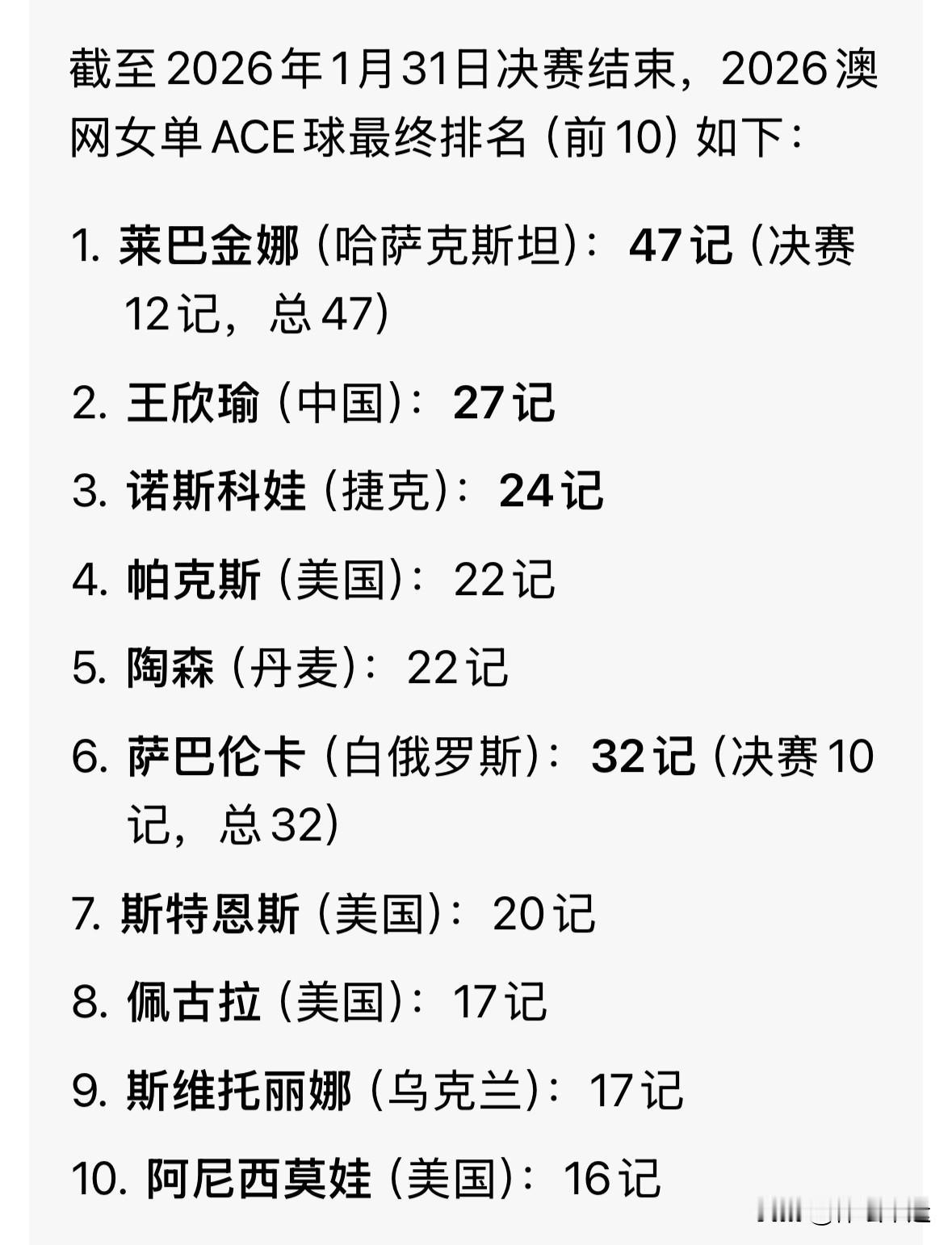 中国金花王欣瑜惊艳众人,她在女单ace排名中位居第二。从16岁初登大满贯正赛的青