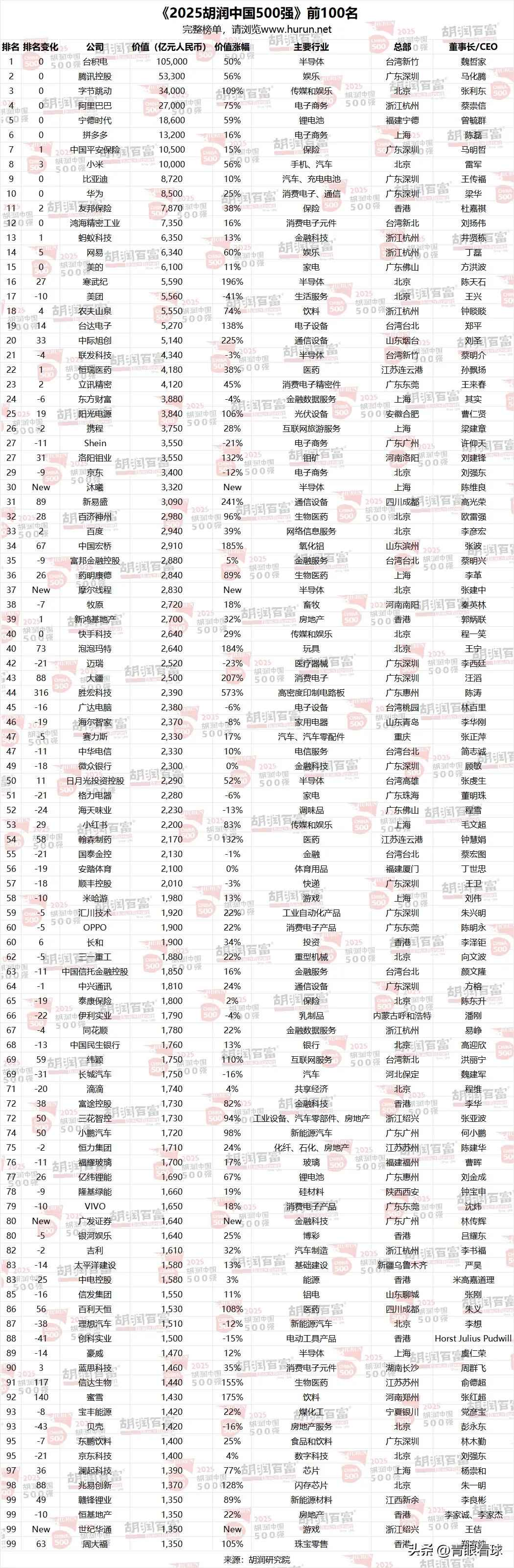 2025胡润中国榜单发布,台积电高居第一,几乎是第二名腾讯的两倍。 台积电的市场价值达到了105000亿元,排名第一。第二名腾讯为53000亿元,台积电接近腾讯的两倍。 第四名阿里巴巴为27000医院,腾讯接近是阿里巴巴的两倍。 字节跳动34000亿元,阿里巴巴已经被字节跳动超越。 美团5560亿元,同比下降41%。 京东3400亿元,同比下降12%。