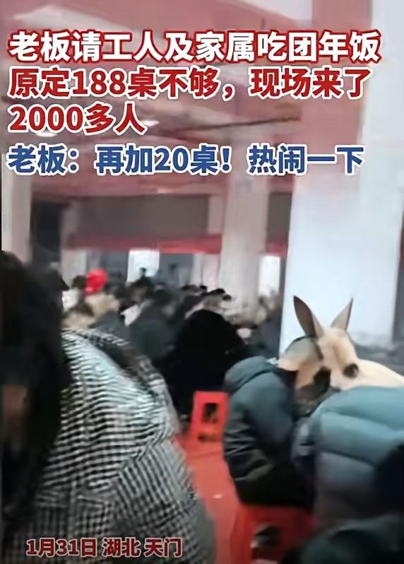 湖北天门一服装厂老板请工人吃团年饭,随口一句“把家属都带上”,直接让饭店经理手忙脚乱! 备下的188桌全坐满,大厅包间挤得水泄不通,门外还站着几百号人,老板见状大手一挥,直接加20桌,让来的人都吃好喝好! 这场团年饭最终来了2000多位宾客,远超预估的1200人,天门特色年菜摆满桌,大人小孩欢声笑语,比村里办喜事还热闹。 这位老板从打工人做起,懂一线的不易,这顿饭从不是心血来潮,而是实打实把员工当家人。 打工人要的从来不止工资,更是被尊重的归属感,这份朴素的人情味,比任何年终奖都暖心,也让企业凝聚了最珍贵的人心。 老板舍得对员工好,员工才会真心跟着干,这才是企业长久发展的硬道理。这样的良心老板,谁不想跟着干?你身边有这么暖心的老板吗?天门聚餐 企业团年宴