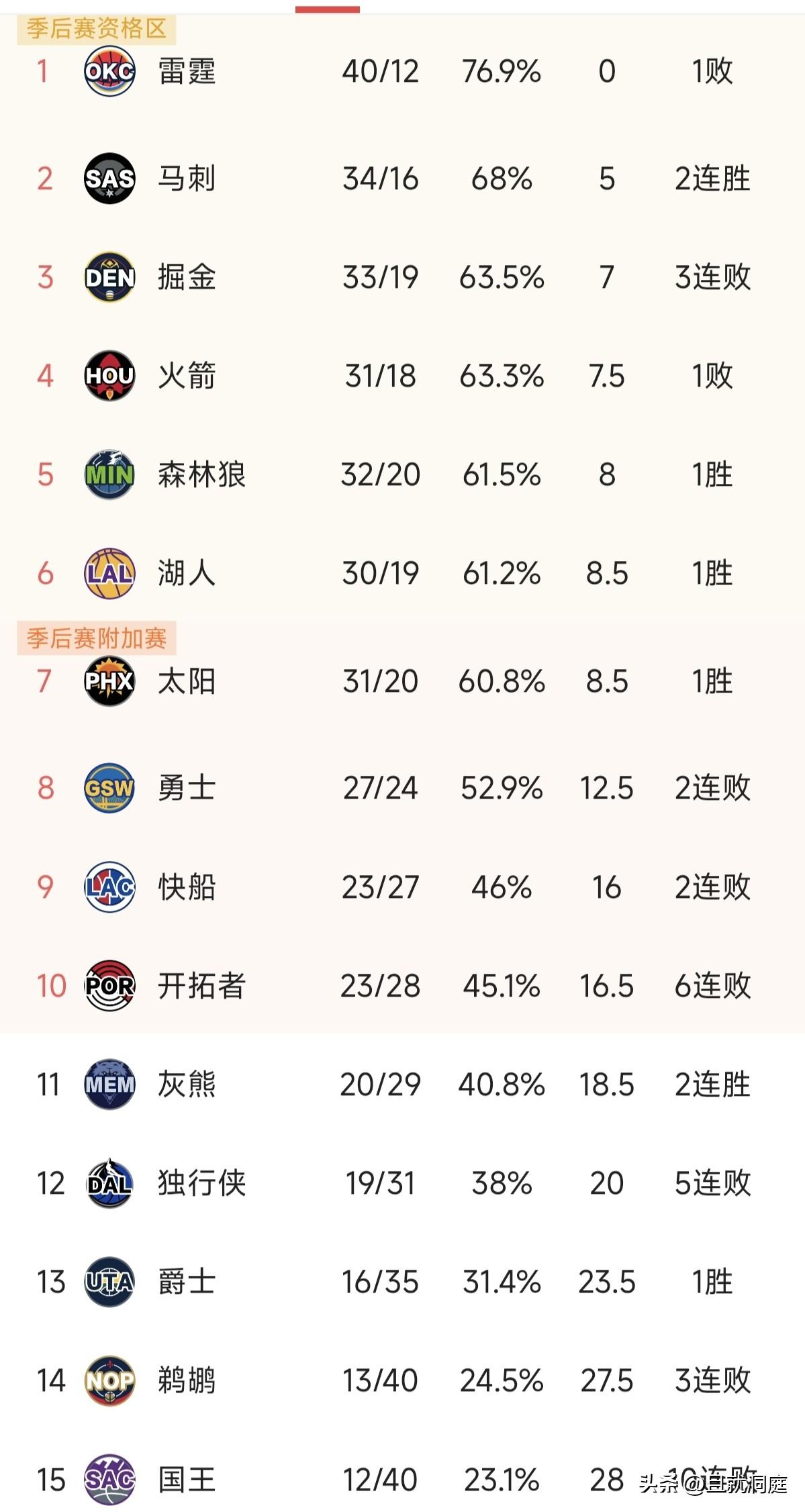 难道掘金有一部分不喜欢约基奇吗?他火线复出四场比赛来一个三连败,就这样了还能排名西部第三我也是醉了! 快船送走了哈登,勇士也交易大调整,两队都是两连败,不过排名第十的开拓者六连败,后面灰熊和独行侠不要摆烂了呀,季后赛还有机会哟! 雷霆最近接连输球,据说亚历山大又要缺席一段时间,约基奇后面全勤的情况下可以参与评选,斑马也是状态越来越好,本赛季MVP到底是哪个还真的不好说。