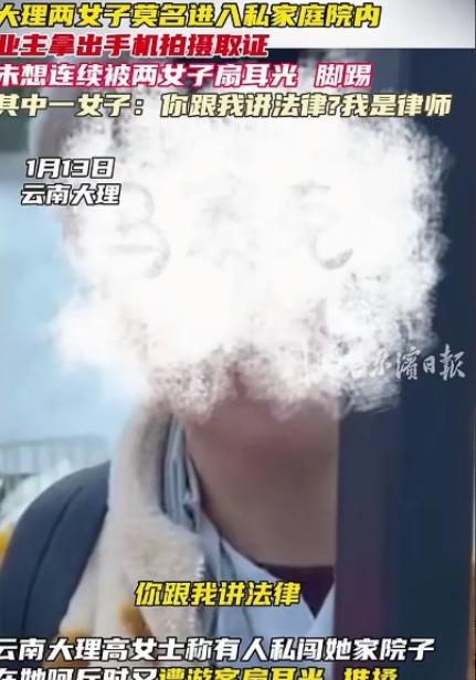 云南大理,两名女子去游玩,路过一家私人院子,看到里面很漂亮,就跑了进去,吓到了业主,业主拿出手机拍摄取证,不料被两名女子扇耳光,还被脚踢,业主足足被围殴了3分钟,业主跟她们讲法律,一个女子扬言道:你跟我讲法律,我是律师,我怕你跟我讲法律吗? 高女士这一条动态在网络上瞬间炸开了锅。她拿着医院的伤情报告,一字不落地写下事情的经过,照片和视频一起上传,整个事件像一颗炸弹,瞬间引起了成千上万网友的关注和热议。 据高女士回忆,那天她像往常一样在院子里整理花木,突然听到院门口传来脚步声和窃笑声,她抬头一看,两个年轻女子正笑嘻嘻地从街上走过来。 高女士本能地拉了拉门链,以为只是路人好奇,但她没想到,这两名女子竟然毫不客气地翻过了她家门槛。她心里一惊,忙喊:“你们这是干什么?这是私人院子!” 没想到两名女子却毫不在意,甚至边笑边走进院子里。高女士气得脸都红了,赶紧掏出手机想要拍摄证据,同时提醒她们:“你们这是私闯民宅,快出去,我要报警了。” 然而,事情完全失控了。两个女子不仅没有理会,反而冲上来直接扇了她耳光,还用脚踢她。高女士被打得几乎站不稳,整个过程足足持续了三分钟,她几乎以为自己要受更重的伤害了。 高女士后来回忆,整个场景就像噩梦一样,两个女子凶神恶煞地围着她,边打边嘲笑她。 她努力后退,尽量保持冷静,一边挡着一边喊:“你们这是违法的!你们知道自己触犯法律了吗?” 让她更加震惊的是,其中一个女子居然冷笑着回答:“你跟我讲法律?我是律师,我怕你跟我讲法律吗?” 语气里充满了挑衅和轻蔑,高女士几乎说不出话来,只能眼睁睁看着自己的身体被连续攻击,心里的惊恐和愤怒交织在一起。 事情发生后,高女士第一时间去医院检查,医生的诊断单清楚显示她面部软组织挫伤、左臂淤血,甚至因为防御反应,手腕也受了轻伤。 她拿着伤情报告,再次上传到网上,把自己从被动到防御的整个过程,以及遭遇的暴力细节,毫无保留地写了出来。 她写道,自己从来没想过去伤害任何人,但保护自己家和财产的权利必须被尊重;更没想到,如今有人竟然公然藐视法律,把“我是律师”当作可以肆意施暴的护身符。 这条动态一经发布,立刻引发了大量网友的评论和转发。有人说:“现在的游客太嚣张了,居然敢闯人家院子,还打人,太离谱了!” 也有人愤慨地表示:“她说自己是律师就可以随便打人?法律不是拿来炫耀的,是用来保护每个人的!”还有网友感叹:“高女士真勇敢,独自面对两个人的围攻还能拿出手机拍证据,不容易。” 高女士看到这些评论,心里有一种复杂的感受。 一方面,她为得到公众支持感到些许安慰,觉得自己并非孤立无援;另一方面,她心里仍然难平,因为事情发生得太突然,暴力的过程让她至今心有余悸。 她在网络上写道:“我真的不想事情闹大,但如果不曝光,我怕更多人遭遇同样的事情。” 网络上的热议不仅仅停留在同情和声讨。 有人开始讨论游客与私人空间的界限,有人质疑法律认知的普及情况,也有人表示,案件本身还需要警方调查,但从高女士提供的照片和伤情来看,这已经不仅是“普通的闹剧”,而是严重的暴力事件和侵权行为。 甚至有人贴出类似案例,说这类“自以为律师就可以为所欲为”的行为,在法律上根本站不住脚,引发了网友们一波接一波的法律科普。 随着讨论发酵,这件事迅速成为大理本地以及全国范围内的热门话题。 有媒体联系高女士,希望采访她的经历,她委婉地拒绝了,只希望事件能够通过法律途径解决,两个女子能为自己的行为负责。 网友们也在评论里为她加油:“一定要报警,不能让这种人逍遥法外。”“支持高女士,勇敢曝光这种行为,希望警方严肃处理。”