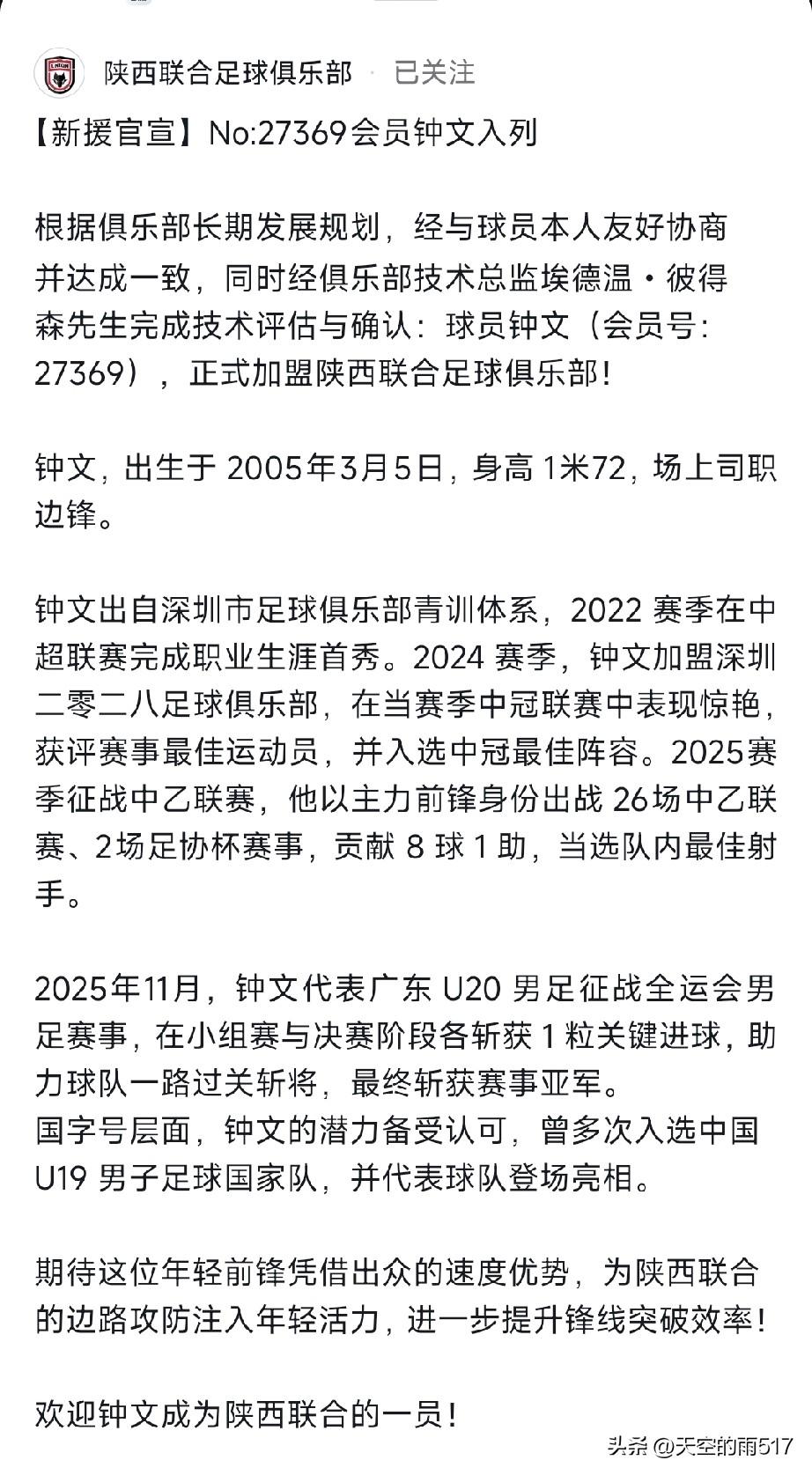 陕西联合又添猛将!2月5日,俱乐部官宣签下21岁的边锋钟文。这小伙出生于2005年,出自深圳队青训,2022赛季完成中超首秀。2024赛季中冠联赛,他表现惊人,获评最佳运动员还入选最佳阵容。2025赛季中乙,他26场比赛贡献8球1助,成队内最佳射手,全运会也有关键进球。 他多次入选国青,速度优势明显。虽说身板嫩、对抗和传中有待提升,但陕西联合青训和一队衔接好,能让他在比赛里成长。期待钟文给陕西联合边路带来活力,踢出精彩表现!