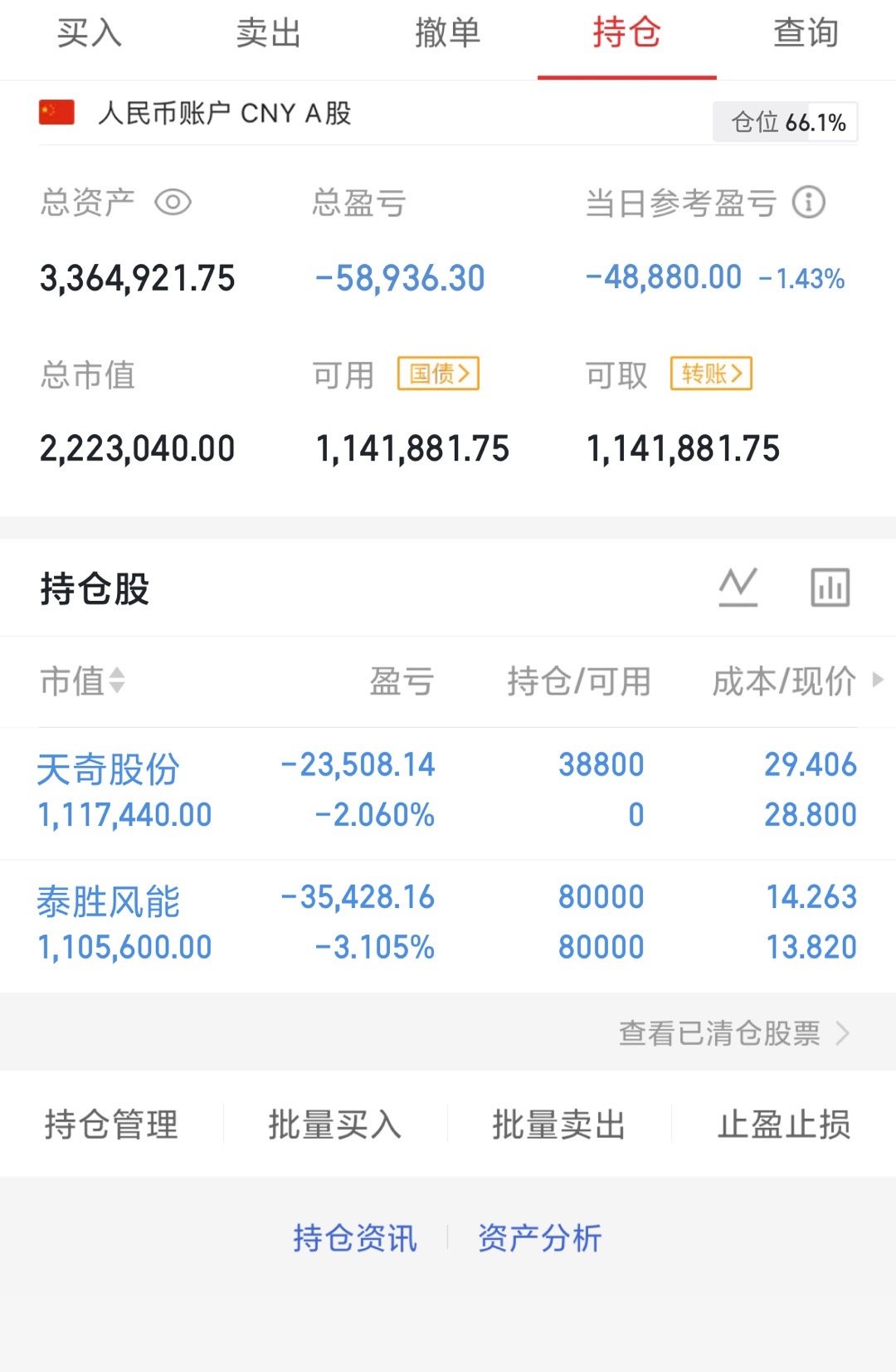今天手上的两只票表现的还不错,天奇股份吃肉了,泰胜风能,加油!!! 现在的行情,