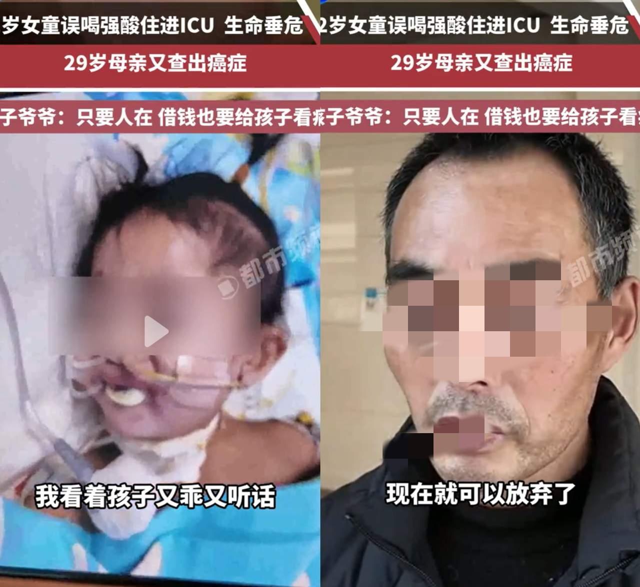河南滑县这户农家,被命运的重锤接连砸懵!2岁小沐苒趁爷爷转身干农活,扒开下水道强酸剂猛嘬一口,嘴喉瞬间灼红,疼得小身子蜷成一团抽搐哭嚎,家人连夜火急送新乡医院。老两口守ICU外34天,眼熬红背佝偻,枯手扒着玻璃门连盹都不敢打,好不容易接娃回家,当晚孩子就呼吸困难翻白眼,连夜转郑州做气切。 屋漏偏逢连夜雨!就在这焦头烂额的节骨眼,孩子妈听闻噩耗当场瘫倒晕厥,一查竟是乳腺癌中晚期,哎……真的苦命一家人。孩子爸攥着诊断书指尖发白,红着眼咬着牙对媳妇说:“咱撑住,娃还等着咱!”转头陪妻回滑县化疗,一家四口分隔两地。 俩月15万天价治疗费直接掏空家底,老两口蜷走廊啃干馍就凉水,爷爷死死攥着孙女的胃管,奶奶抹泪哑嗓念叨:“不怨谁,一家人抱团扛,总会有希望的!”可面朝黄土背朝天刨的血汗钱,哪经得住两场重病轮番糟践?要是没第三方责任的意外专挑寒门,这家人的坎到底该咋迈?悲剧 癌