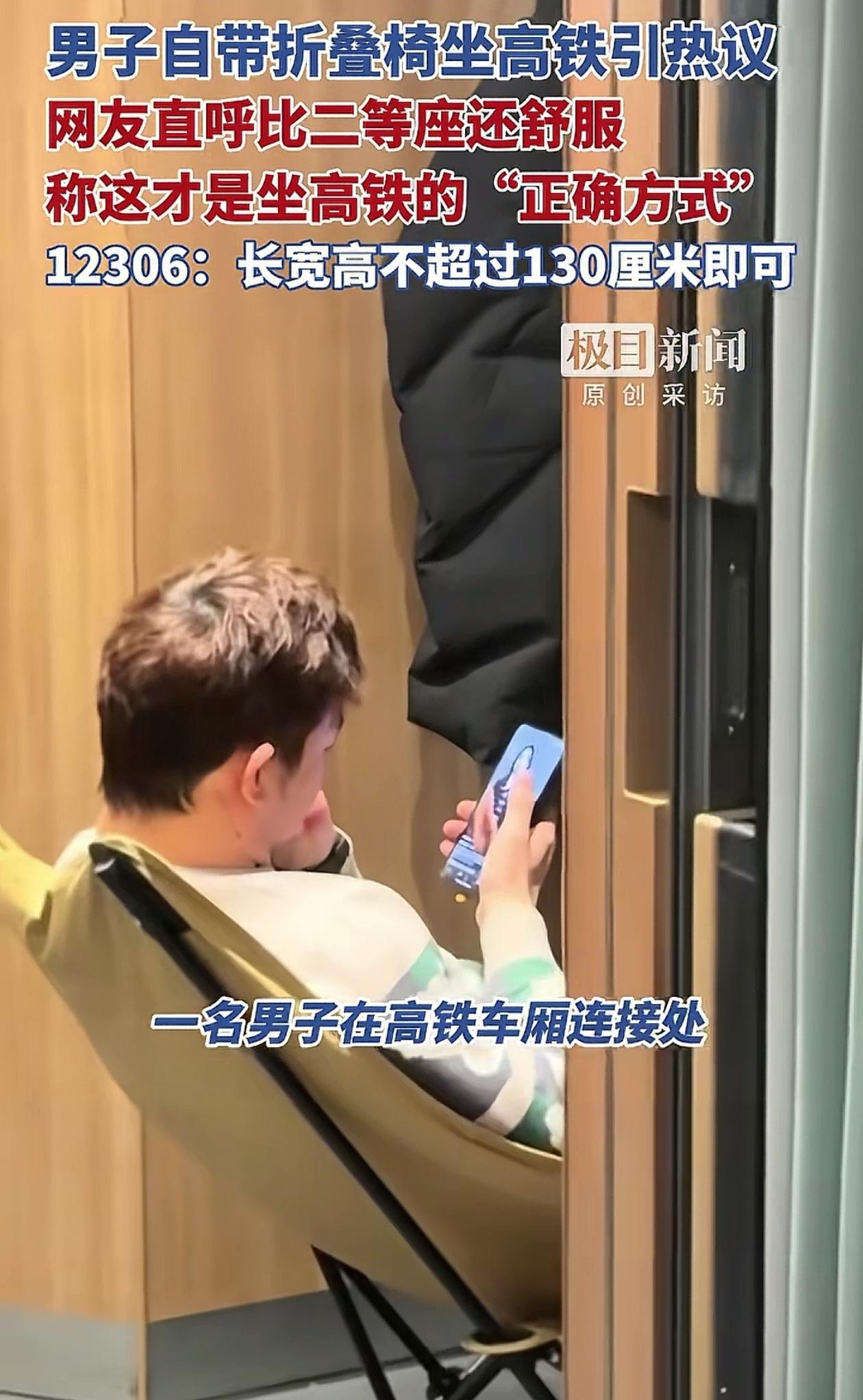 人怎么能聪明成这样?浙江一男子坐高铁没买到坐票,只能站着,正当他发愁的时候,却看见旁边一位站着的小伙,掏出一张小折叠椅,直接坐了下来。网友:“这比二等座都舒服!” 这才是坐高铁的正确打开方式吧? 只见小伙把折叠椅摆在了车厢连接处的过道里,这个地方不仅空间大,还没什么人,非常方便。 然后他就坐了下去,靠在椅背上悠闲地刷起了手机。不仅地方大,坐着还舒服,这比二等座强多了! 男子非常羡慕,就把自己看见的一幕发到了网上,有经验的网友说这招确实好使,甚至可以现场救急买一个小椅子用。也有网友觉得这个办法很鸡肋,平时座位足够用不上,春运期间人太多又没地方放。 不过大家得注意,无座是只能在二等座的地区摆小椅子,可别觉得自己很聪明,特意跑到商务座一等座去摆,那可就违反规定了。 相比较起来,这个办法对钓鱼佬还是比较友好的,他们直接把平时钓鱼用的小马扎带上就行了,完全没必要额外再买一个,可以说是一举两得。