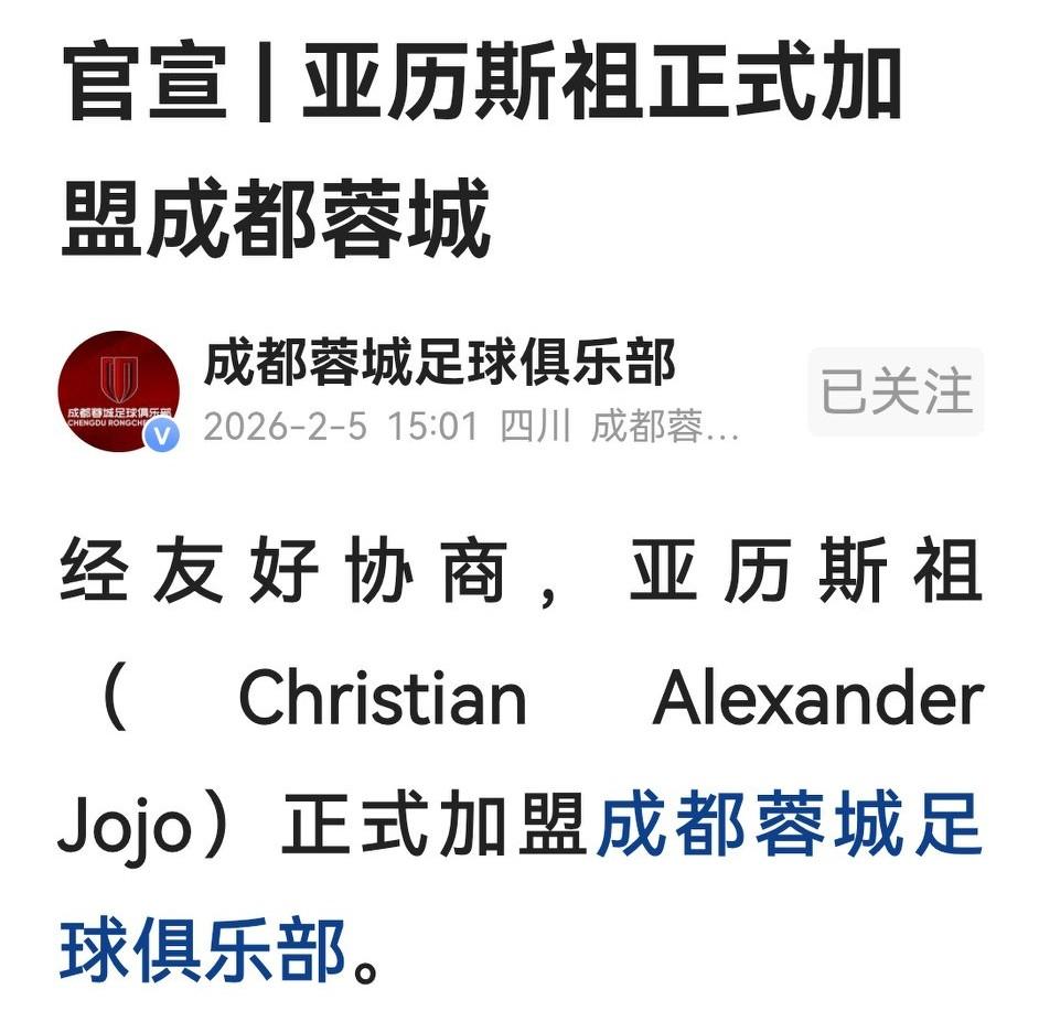 蓉迷们,官宣了,亚历斯祖正式加盟成都蓉城。 27岁的小祖青少年时在葡萄牙和瑞典踢球,5年前转到中国香港,在联赛和足总杯都拿过冠军,上赛季代表海港拿过中超冠军,不管表现如何,也算出自名门。 按官宣说法,小祖可打右后右中右前卫,有“带刀后卫”属性,能增加“轮换”选择的灵活性。从某种角度讲,这定位不高,他确需拿表现来证明。 管他呢,来都来了,蓉迷们理当大喊一声:小祖,欢迎加入蓉城大家庭!