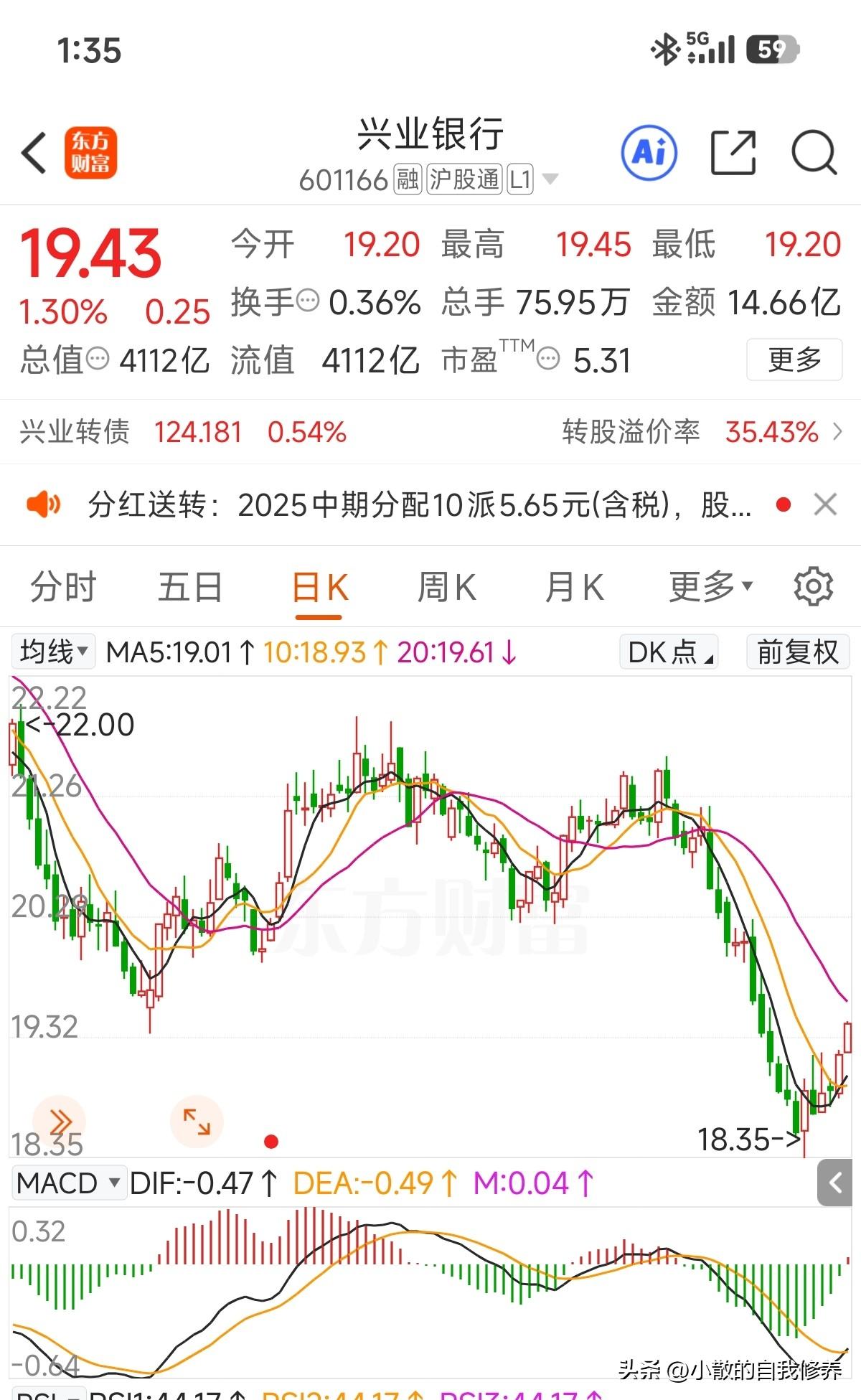 今天晚上就能收到股息了,分红前就开启反弹了!看来想复投拿个好位置有点难了[捂脸]! 招商银行复投进去硬是被按着摩擦了半个月左右,这会终于也出坑了!很多人看不上这股息,认为您看中是股息,别人看中是你本金!真是这样? 以个人持股银行来说,拉长时间看股息是到手了,本金人家也没拿走[呲牙]!再说我不单看中股息,还盯着之后估值修复带来的市值增长呢!