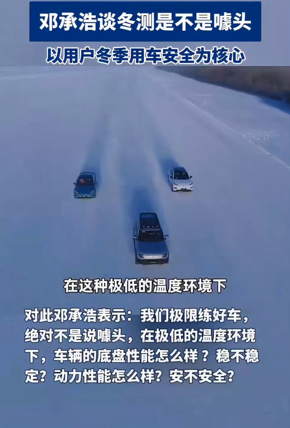 邓承浩谈冬测是不是噱头低温下汽车的底盘稳定性、动力表现、安全与续航,都要通过严苛测试来验证,目的是让用户更安心。所以测试应实事求是,用真实数据说话,把极限场景下的表现练扎实,才是对用户负责,也让冬测回归技术本质,而非营销手段。邓承浩回应行业冬测作假质疑