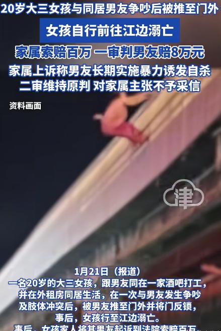 “可惜了!”湖北武汉,20岁女子和男友同居生活,两人一起在一家酒吧上班,女子下班回家,和男友发生口角,男友把她推出门外,并反锁房门,女子独自走到江边,溺水而亡。女子父母得知女儿去世后,悲痛欲绝,一纸诉状,将男子告上法庭,要求男子赔偿104万元。 女孩苏某,20岁,还没大学毕业,正读大三。按理说,这个年纪,本该是在校园里忙着实习、论文、考证,偶尔和同学吐槽一下老师、未来、工作焦虑。她的人生,才刚刚展开一角。 苏某为了多攒点生活费,也想提前接触社会,便在校外找了一份实习工作。也是在那段时间,她认识了王某。 王某比她大几岁,两人同在一家酒吧上班,一个做服务,一个负责吧台。每天晚上一起上班,下班又顺路同行,时间久了,自然而然就走到了一起。 恋爱刚开始的时候,一切看起来都挺正常。王某会等她下班,天冷了提醒她多穿点衣服;苏某也会给他带夜宵,帮他收拾屋子。后来,为了省房租,两人干脆同居了。 可真正住在一起后,问题也慢慢显露出来。 酒吧的工作环境复杂,免不了要陪客人喝酒。苏某年纪小,酒量不算好,但为了工作,有时候也会硬着头皮帮同事分担。王某对此一直心里不舒服,嘴上不说,情绪却积压着。 出事那天晚上,苏某下班回家,身上带着点酒味。王某一闻就不高兴了,脸立马拉了下来。 “你又帮别人喝酒了吧?” “这是工作,又不是我自己想喝。” “工作就非得这么干?你一个女孩子,成天在外面陪酒,你觉得合适吗?” 一句一句,说着说着,火气就上来了。苏某本来就累,被这么一数落,心里也不服气。 “你管得也太多了吧?我又没做什么出格的事。” “我是不想你被人占便宜!” “那你别让我干这工作啊?房租你出吗?” 话赶话,谁也不让谁。王某情绪一上头,掏出手机,当着她的面,把她微信给删了,还冷冷地来了一句:“你爱怎么样怎么样。” 这一举动,彻底点燃了苏某的情绪。 她一把掀翻了桌子,桌上的东西哗啦掉了一地。两人从吵架,变成了推搡拉扯。屋子本来就不大,拉扯间,靠在墙边的全身镜被撞倒,“哗啦”一声碎了一地。 玻璃飞溅,苏某的腿和手被划伤,血一下子就渗了出来。 可让人没想到的是,王某不仅没有去扶她,反而更加恼火。他觉得自己被“挑战了底线”,一气之下,把她往门外推。 “你给我出去,冷静冷静!” 门被“砰”地一声关上,随后反锁。屋里安静下来,只剩下王某急促的呼吸声。 而屋外,苏某站在楼道里,身上没带手机,脚上穿着拖鞋,腿上的伤口还在流血。她敲了几下门,没有回应。那一刻,她心里的委屈、愤怒、失望,全都涌了上来。 她没再敲门,转身下了楼。 夜里的武汉江边,风很大。路灯一盏一盏亮着,江水在黑暗中翻涌。她一个人坐在江边,情绪彻底失控。没人知道她当时在想什么,只知道,等到第二天被发现时,她已经溺水身亡。 消息传到家里,苏某的父母几乎当场崩溃。 他们怎么也想不通,前几天还在视频里笑着说“等毕业就回家”的女儿,怎么就没了。更让他们无法接受的是,女儿最后的遭遇,竟然是被男友赶出家门。 悲痛之下,父母一纸诉状,将王某告上法庭,要求赔偿104万元。 他们认为,如果不是王某当晚的争吵、拉扯,以及把女儿推出门外、反锁房门,女儿不可能走到江边,更不可能发生悲剧。 案件进入审理阶段后,引发了不少关注。 法院认为,虽然苏某最终选择前往江边并发生溺水,属于其自身行为,但不能忽视事发前王某的行为。 两人发生激烈争吵和拉扯,镜子倒地致苏某受伤,随后王某将其赶出家门并反锁房门,这一系列行为,对苏某离家并最终发生溺水,具有明显的诱发作用。 也就是说,王某的行为,不能完全免责。 最终,一审法院酌情判定:王某向苏某家属赔偿8万元。 判决结果出来后,舆论再次炸开了锅。有人觉得赔得太少,“一条命就值8万?”也有人说,法律已经在责任范围内给出了判决。 很多网友叹息:如果那天有人冷静一点;如果门没有被反锁;如果有人追出去把她拉回来;如果……可惜,世上没有如果。 所以才有人说:有些气,真的不能随便撒;有些门,真的不能随便关。因为你永远不知道,下一秒,会不会就是永别。