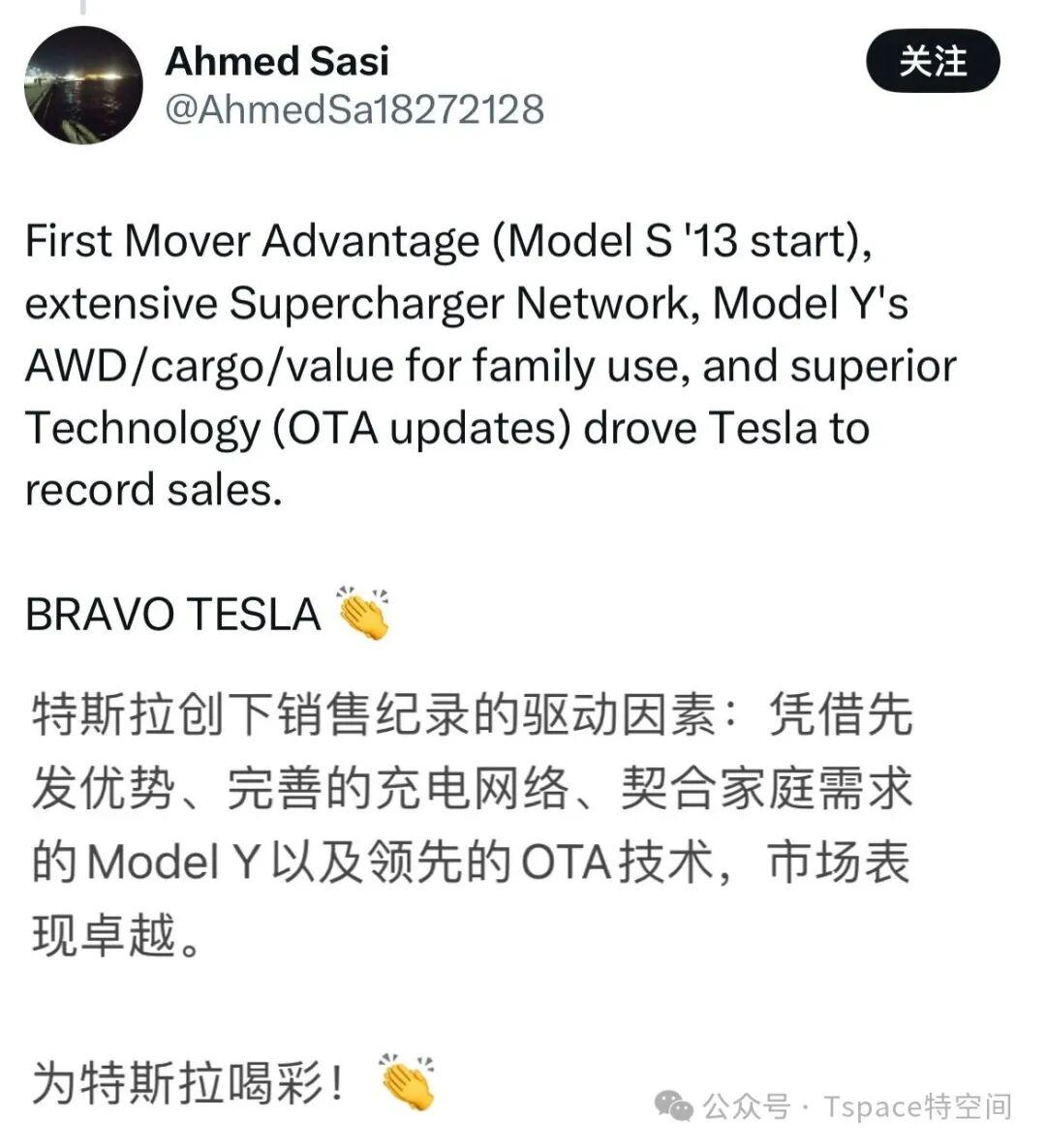 网友Ahmed Sasi 分析认为,在素有“燃油车大本营”之称的欧洲市场,特斯拉凭借出色的产品实力保持热销态势,背后得益于其在纯电领域长期积累的技术实力、完善的超级充电网络布局,以及行业领先的OTA远程软件升级所构建的系统性优势。