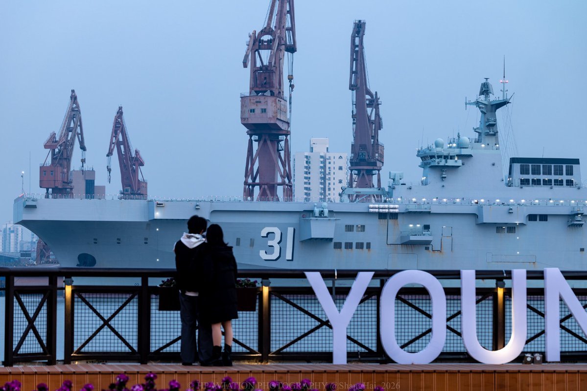 一对小情侣在江边远眺即将入坞维护的075级31号海南舰