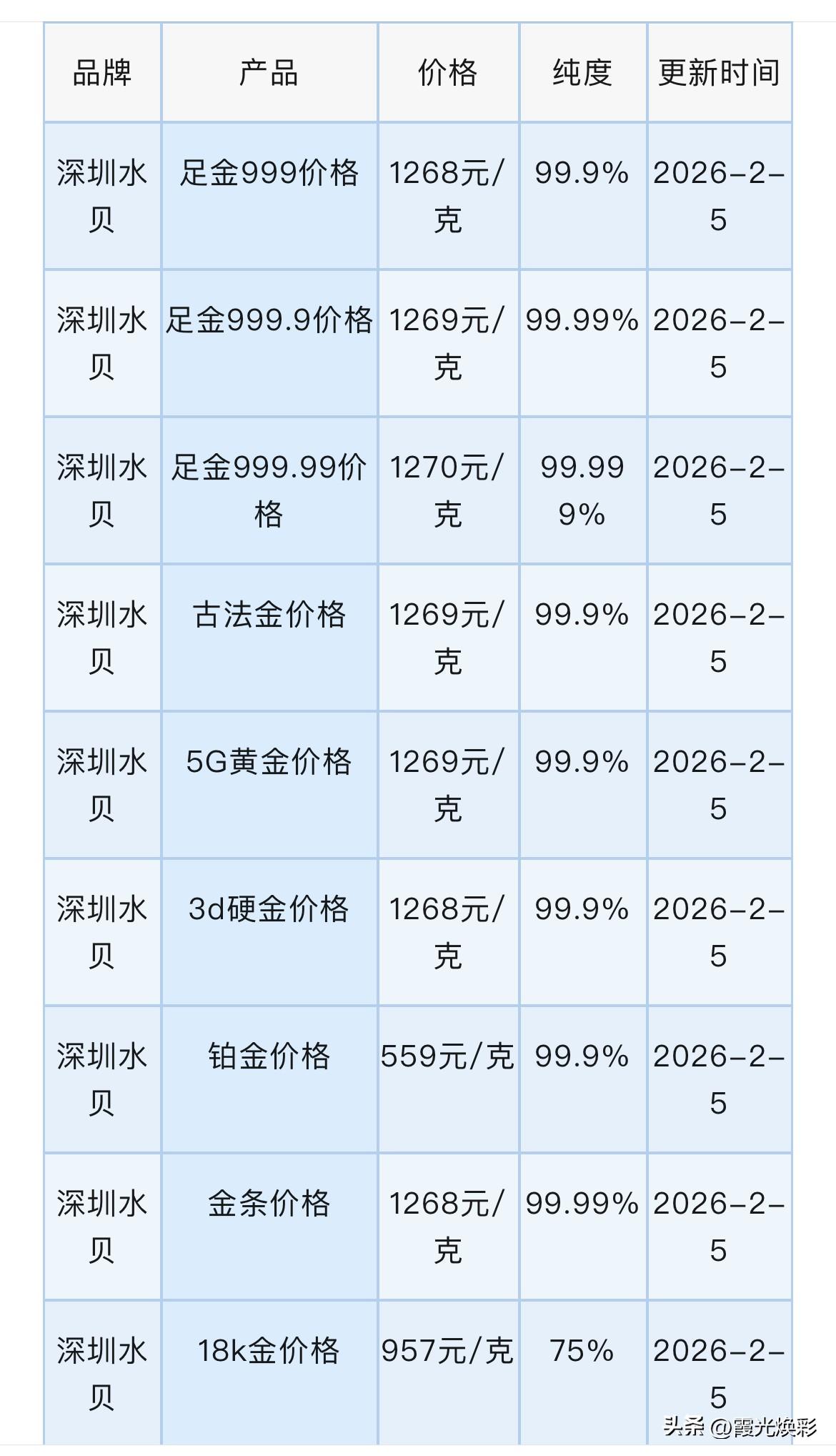 今日深圳水贝黄金、铂金批发报价! 那么来看看,水贝黄金、铂金批发是多少钱一克了? 水贝足金999价格1268元/克, 水贝金条价格1268元/克, 水贝古法金价格1269元/克, 水贝铂金价格559元/克。 同昨天(2月4日)深圳水贝黄金及各品种批发价格相比较,今天水贝黄金各品种批发价格都整体下跌了。 金条、足金3个9、4个9、5个9、古法金、5G黄金、3d硬金批发价格各分别整体下降了11元/克,18k金批发价格下降了8元/克,铂金回收价格下降了2元/克。 深圳水贝今日金价等于1268 元/克。工费另计,不同的黄金款式工费有所差异(每克10元至35元不等)。 另外,今日水贝黄金回收今日价格等于1088元/克。 根据黄金价格网消息:周四(2月5日)亚市,金银再度闪崩!白银一度跌16%至74美元,两日反弹成果尽失;黄金一度重挫3.3%下破4800美元。市场权衡沃什政策立场,特朗普称“几乎无疑还会降息”缓解鹰派担忧,但ETF赎回与波动率爆表令多头退守。机构普遍认为地缘与货币结构性利多未改,高波动成常态,黄金长期逻辑仍优于白银。 周三(2月4日)金价冲高回落,早盘冲高5092美元,22点后开始直线跳水,一度回落至4853美元,收盘微涨0.4%报4965美元。主因美元反弹+美伊会谈预期缓和地缘风险,引发高位获利盘。 来分享个选黄金三技巧: 1,那么怎么选黄金呢? 首先黄金不需要选品牌,因为黄金的纯度一样,只是品牌溢价导致价格有所不同,建议哪家合适买哪家,尽量不要选一口价金饰,折算下来每克单价太高,建议按克购买最划算。 2,如何判断我买的黄金是否是纯金? 直接看内壁的钢印,3个9和4个9代表黄金的纯度,足金上面印有AU 999、G999和足金999的字样,如果只有999,你真的要当心。 3,那3D 5G古法金是真的黄金吗?这里有什么区别? 3D 、5G和普通黄金都是真黄金,只是工艺不同,加工过后硬度更高,不容易变形。古法黄金是纯手工制作,工艺性更强。 再来分享个散客怎么足水贝购买黄金呢? 1、金展珠宝广场负一楼,柜台很多,黄金款式多,适合散客逛购买,不过人多拥挤。 2、水贝国际、金座、壹号、银座、特力等是贯通的,这里除了黄金还有铂金、钻石、翡翠、珍珠等,人没有那么拥挤。 另外,要申明一下,水贝是全国最大的黄金批发市场,批发价格是国际金价+手工费(不同的工艺,工艺费不一样)。 所有信息,都只是提供参考价值! 购买黄金有风险,投资需要谨慎,不要盲目跟风! 铂金价格 水贝黄金打金 惠州水贝黄金 水贝黄金工费 广东黄金价格 深圳黄金按克卖 北京黄金价格