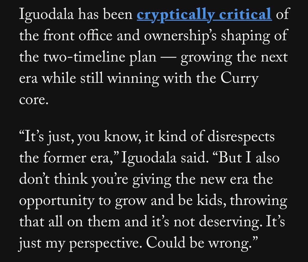 伊戈达拉一直对管理层和老板制定的“双时间线计划”持隐晦的批评态度——该计划旨在培养下一代球员的同时,继续依靠库里核心阵容赢球。