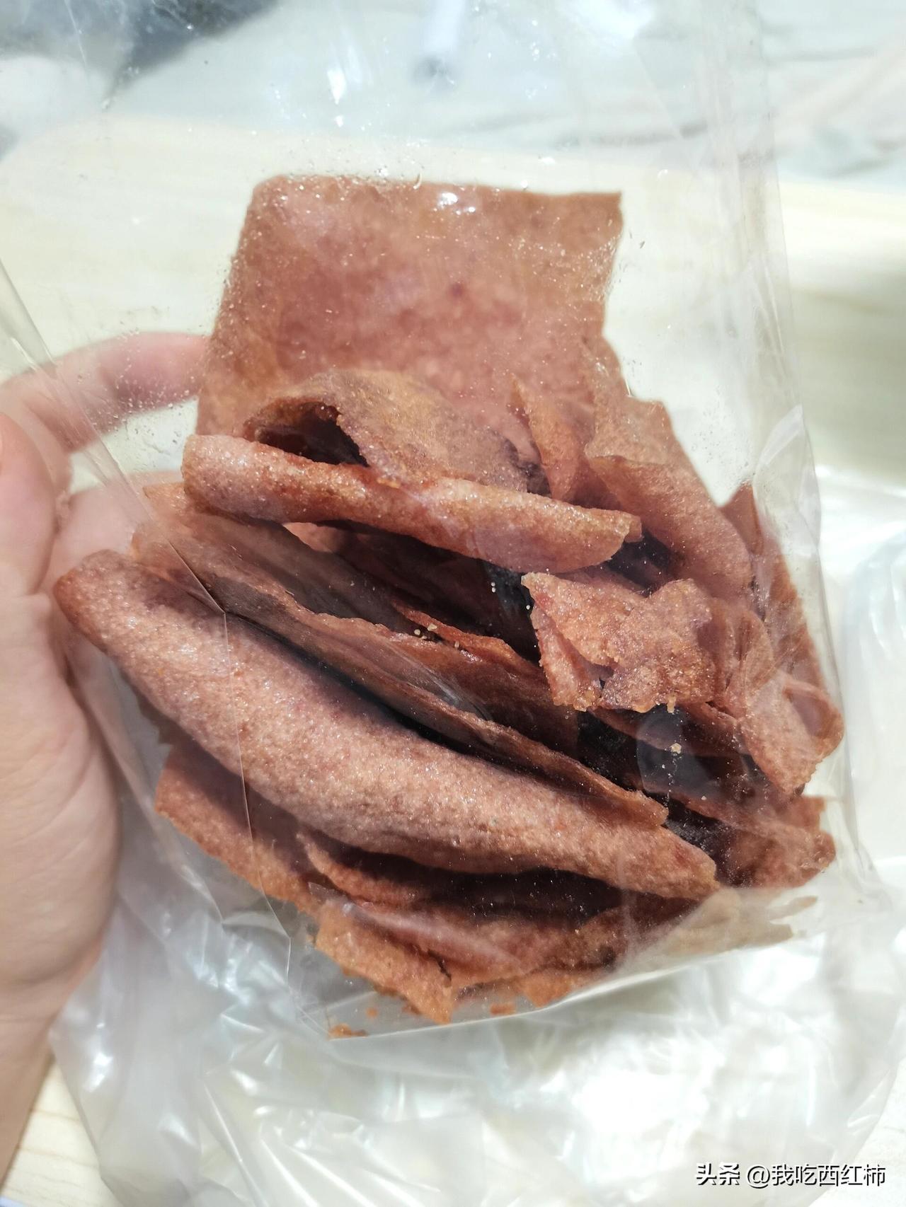 菜摊老板骗我说不甜 经过一个菜摊,看见摊上挂了好几袋这个脆脆零食,一开始以为是红薯干之类的,老板说是脆皮猪肉,我问她甜不甜,她说不甜,70铢还挺大一袋,吃了两三片甜死了,纯甜口,味道跟炸猪皮差不多,但是没有炸猪皮膻,口感很酥脆,这个到底要怎么吃?要蘸酱的吗?