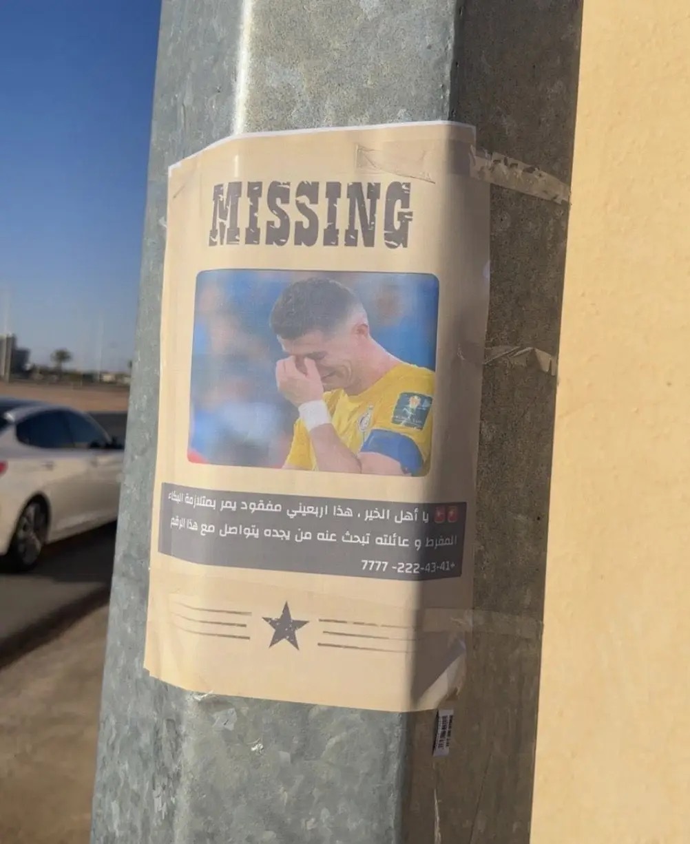 沙特多地出现寻人启事,寻人启事上写着:“好心人,这有一名40多岁的男子,患有过度哭泣症状,他的家人正在找他。如果找到他,请联系这个号码。c罗罢赛