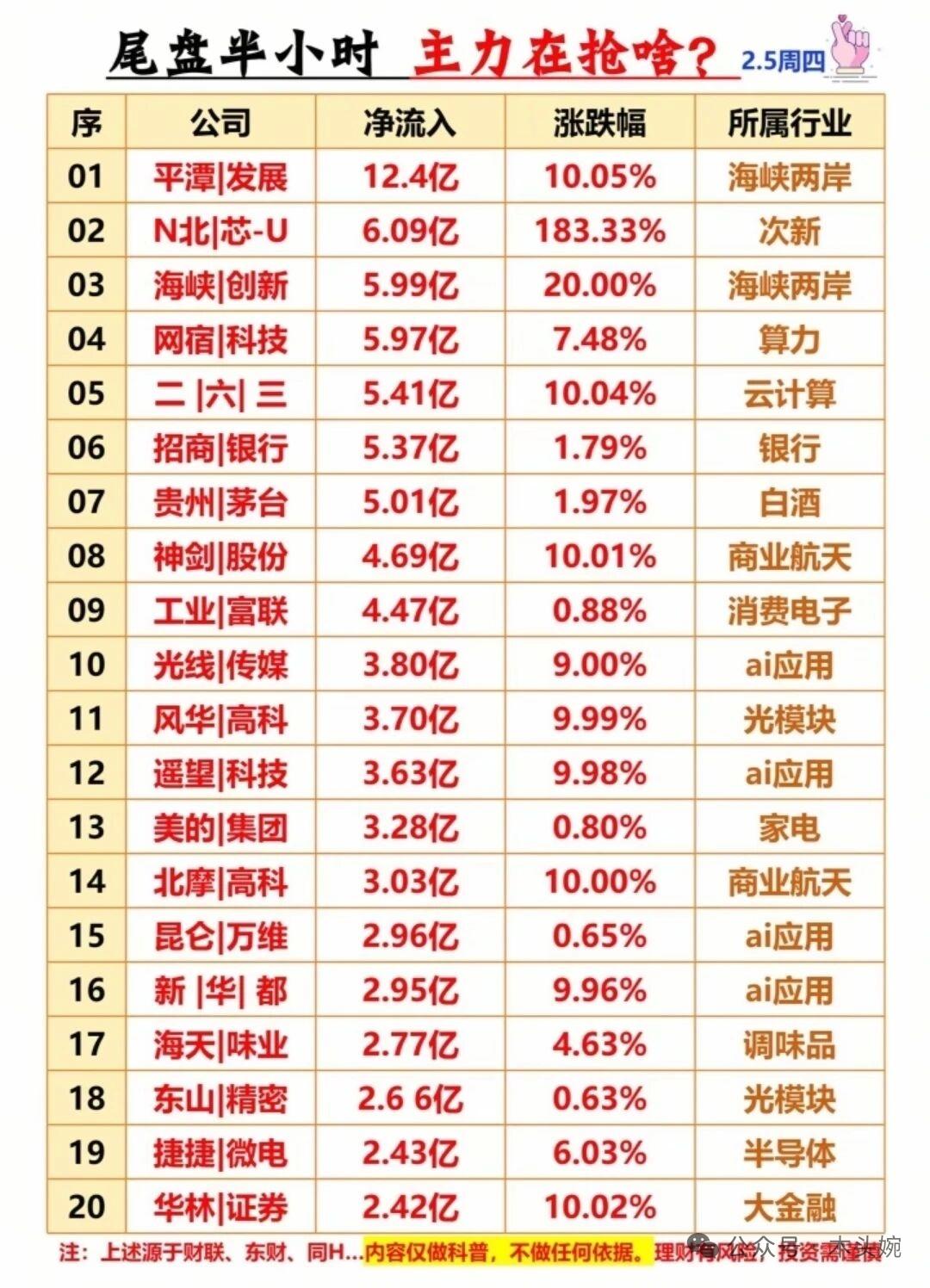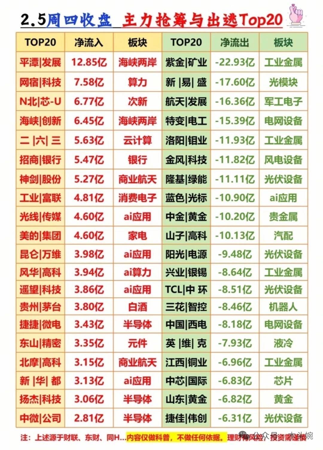 🚨 2月5日周四收盘大揭秘:主力、游资、暗盘资金动向全曝光!主力资金流入哪些个股?尾盘抢筹名单有哪些? 主力资金动向:平潭发展、海峡创新领衔海峡两岸板块吸金超19亿,算力、云计算、商业航天同步获资金重点布局,银行、白酒等权重标的也获增持。 尾盘半小时资金突袭!主力抢筹方向大曝光, 平潭发展、海峡创新领衔海峡两岸板块爆发,半日吸金超18亿;算力、云计算同步走强,网宿科技、二六三获资金追捧。 1以上资金流向、龙虎榜等数据仅为当日市场行为的客观呈现,不构成任何投资建议或操作依据。理财有风险入市需谨慎!大盘资金流向 平潭发展股票 游资资金 科技股资金流向 科技板块资金流 资金活跃板块 平潭股份