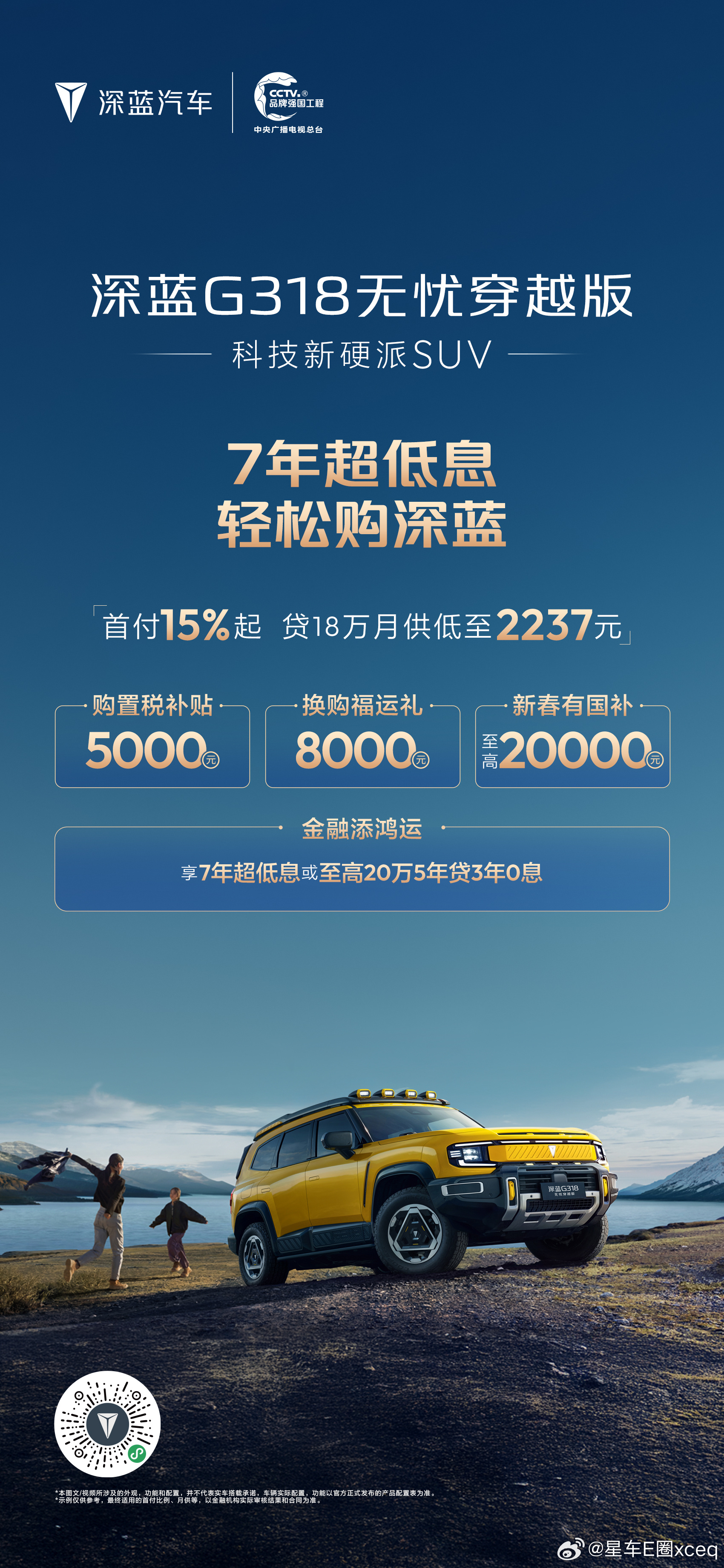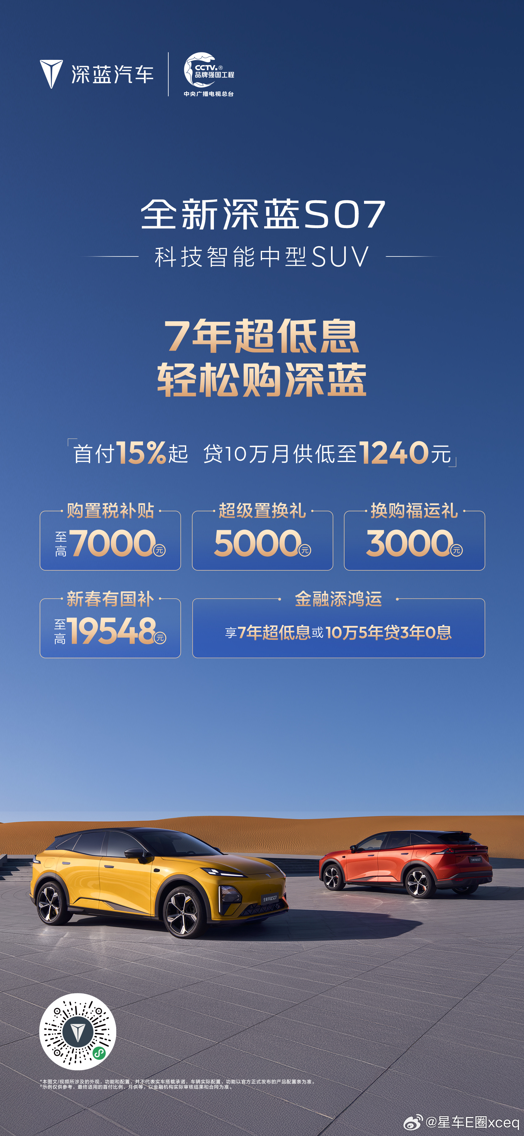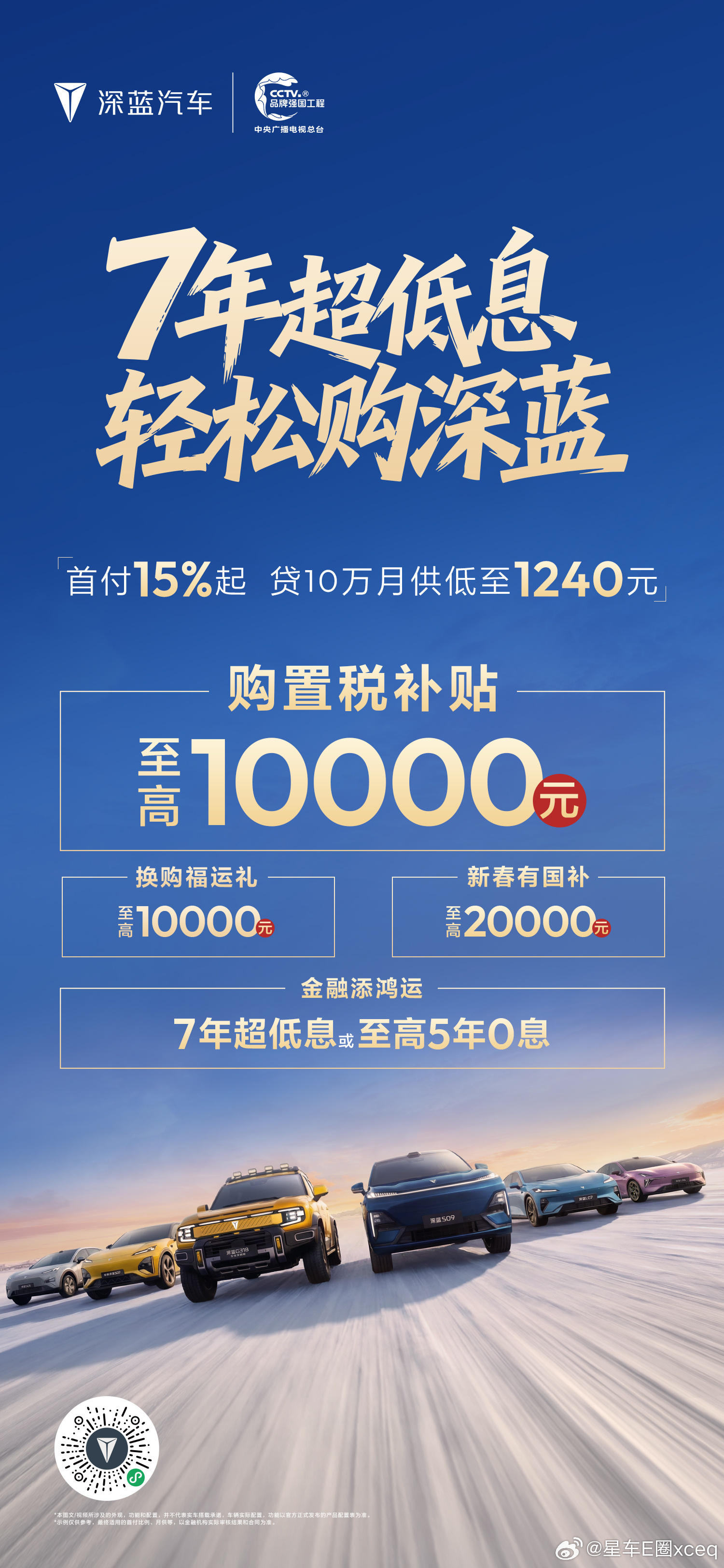 深蓝汽车新春推出“7年超低息 轻松购深蓝”专属金融政策,降低用户购车门槛,助力消费者轻松开起新年旅程。消费者可享“首付15%起月供低至1240元”的7年超低息方案,轻松拥有长续航座驾。同时,活动叠加多重限时礼遇:包括至高10000元购置税补贴、20000元新春国补红包及10000元换购福运礼,以极具诚意的金融方案与全方位补贴,守护每一段安心出行。