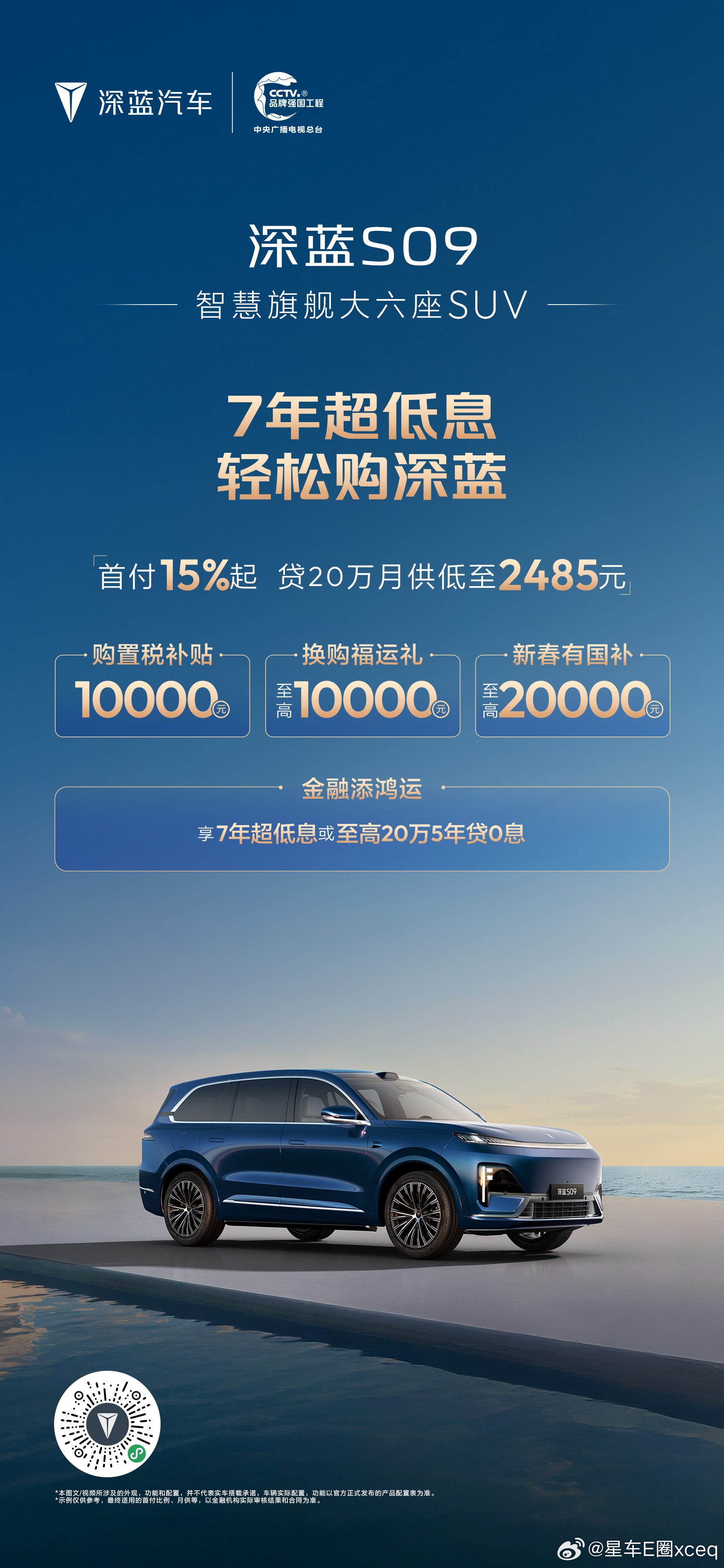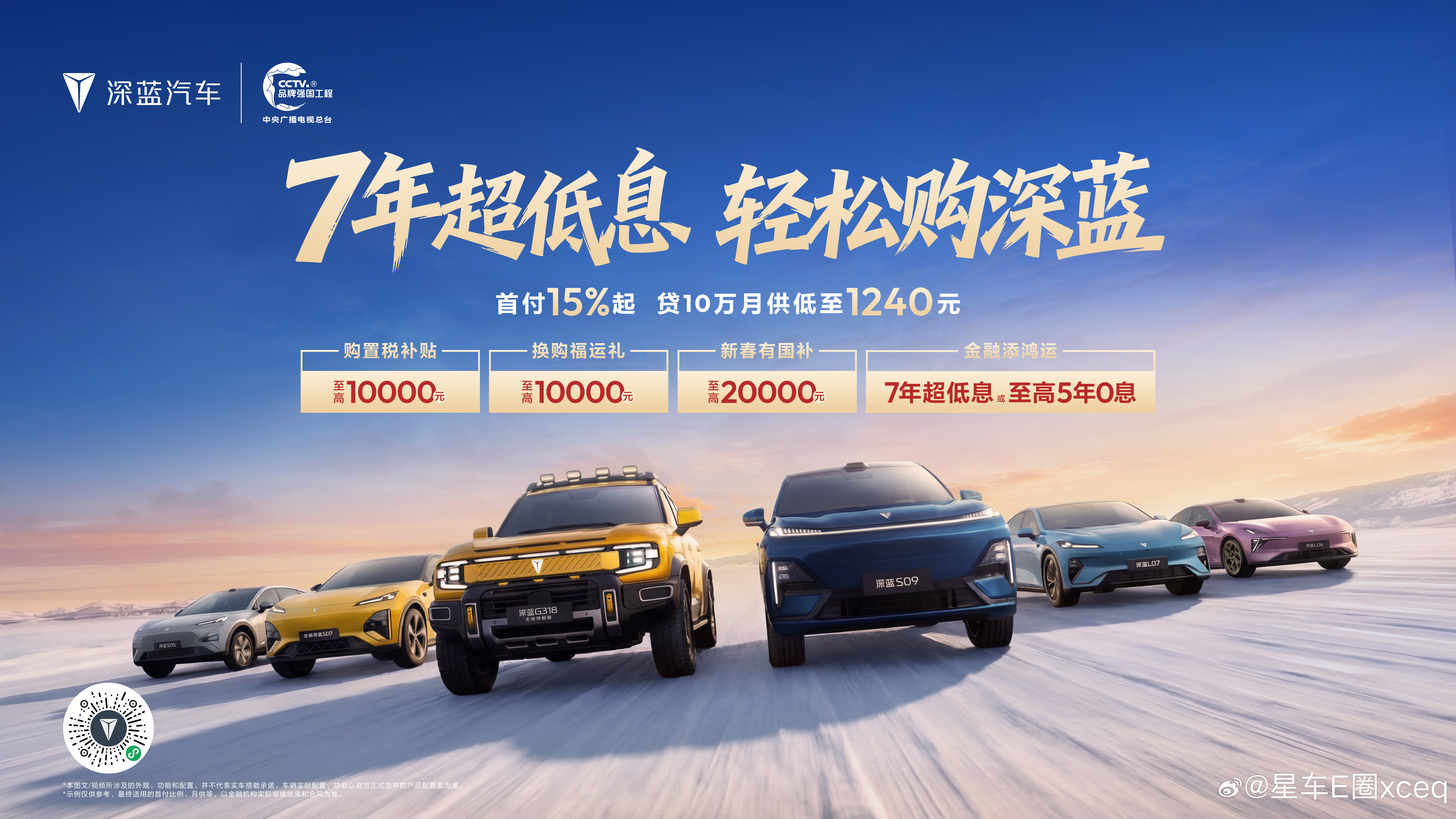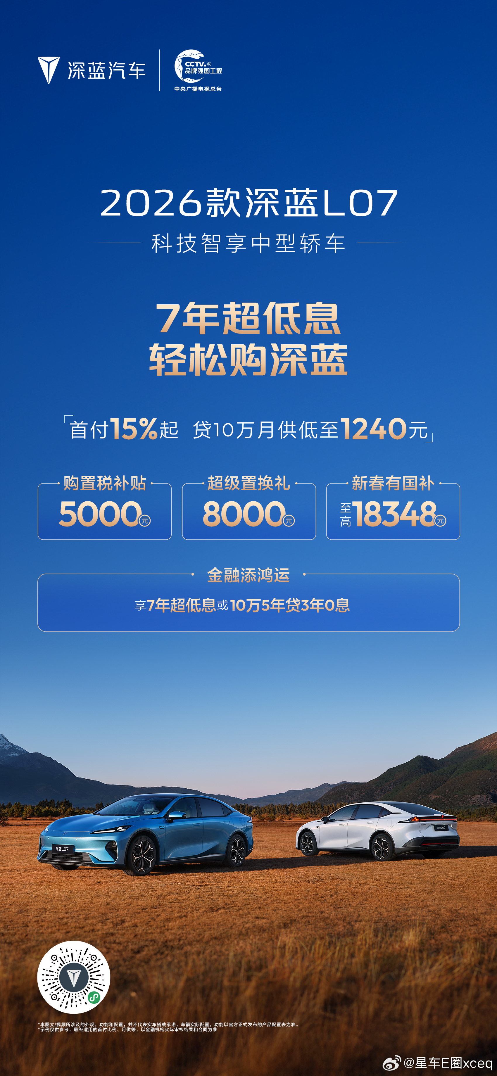 深蓝汽车新春推出“7年超低息 轻松购深蓝”专属金融政策,降低用户购车门槛,助力消费者轻松开起新年旅程。消费者可享“首付15%起月供低至1240元”的7年超低息方案,轻松拥有长续航座驾。同时,活动叠加多重限时礼遇:包括至高10000元购置税补贴、20000元新春国补红包及10000元换购福运礼,以极具诚意的金融方案与全方位补贴,守护每一段安心出行。