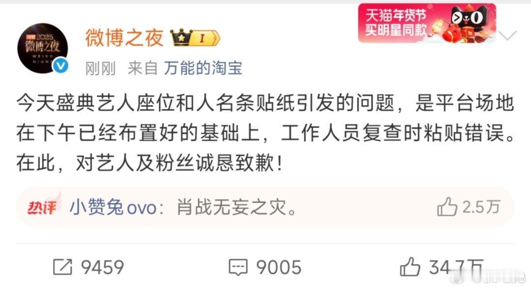 微博之夜回应了肖战杨幂内场座位问题:“工作人员复查时粘贴错误,对艺人及粉丝诚恳