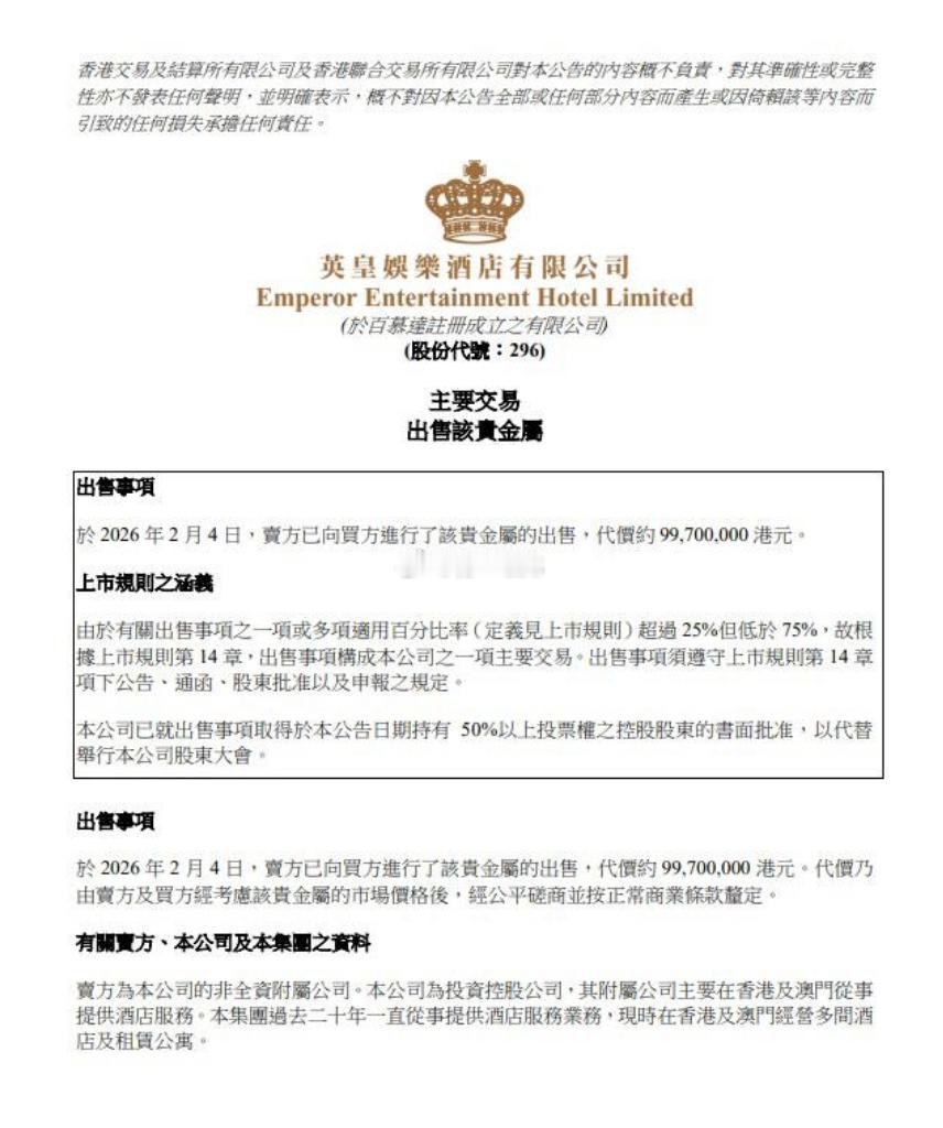 英皇娱乐把澳门英皇娱乐酒店大堂标志性的“黄金大道”里的金砖给卖了,作价约9970万港元,预计可确认收益约9020万港元‼️