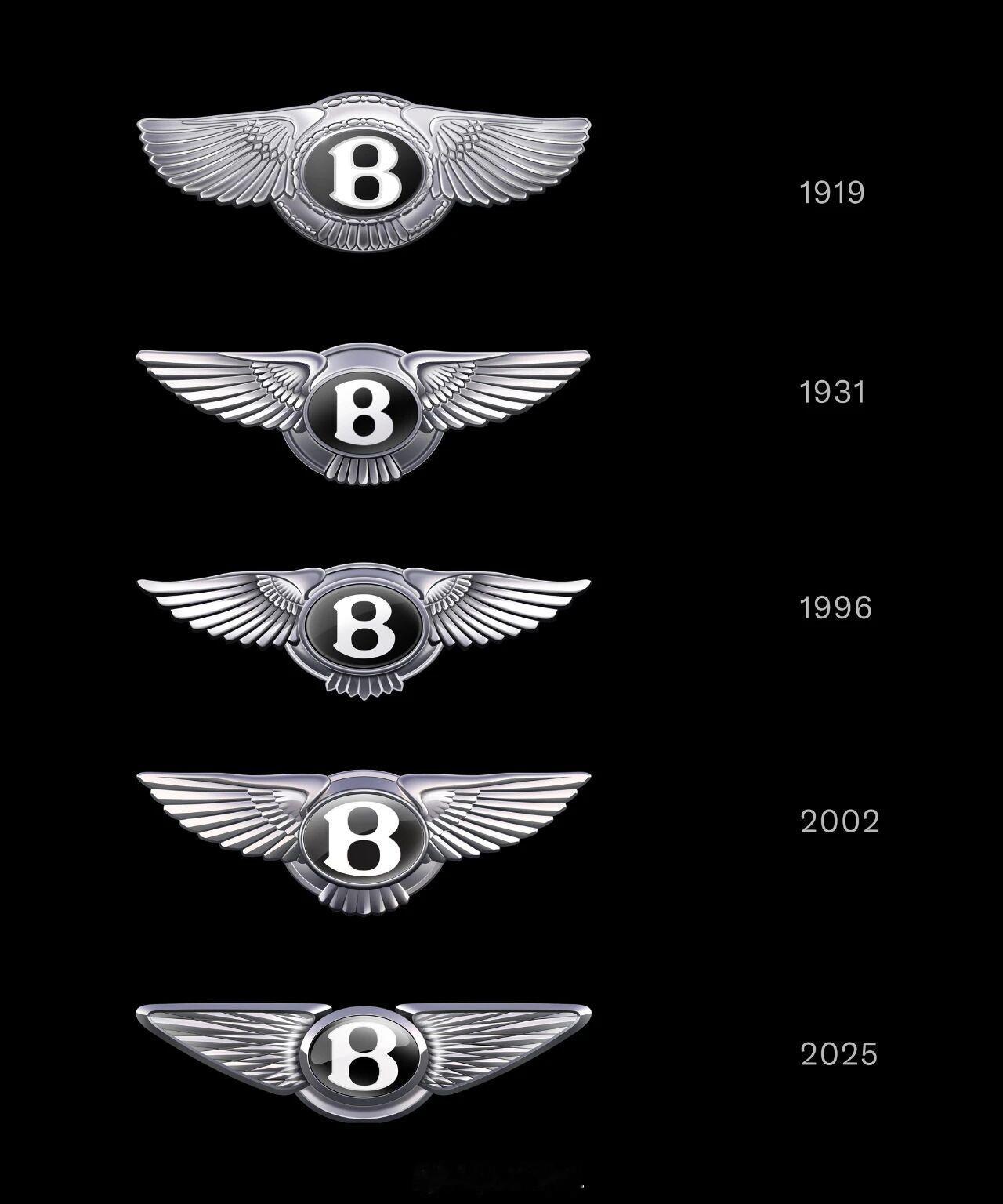 2025年7月,宾利启用全新“B字飞翼”车标,这是品牌创立106年来第5次标志革新。相较旧版的复古写实,新LOGO更轻盈、干练,呈现出更具现代感的品牌气质。