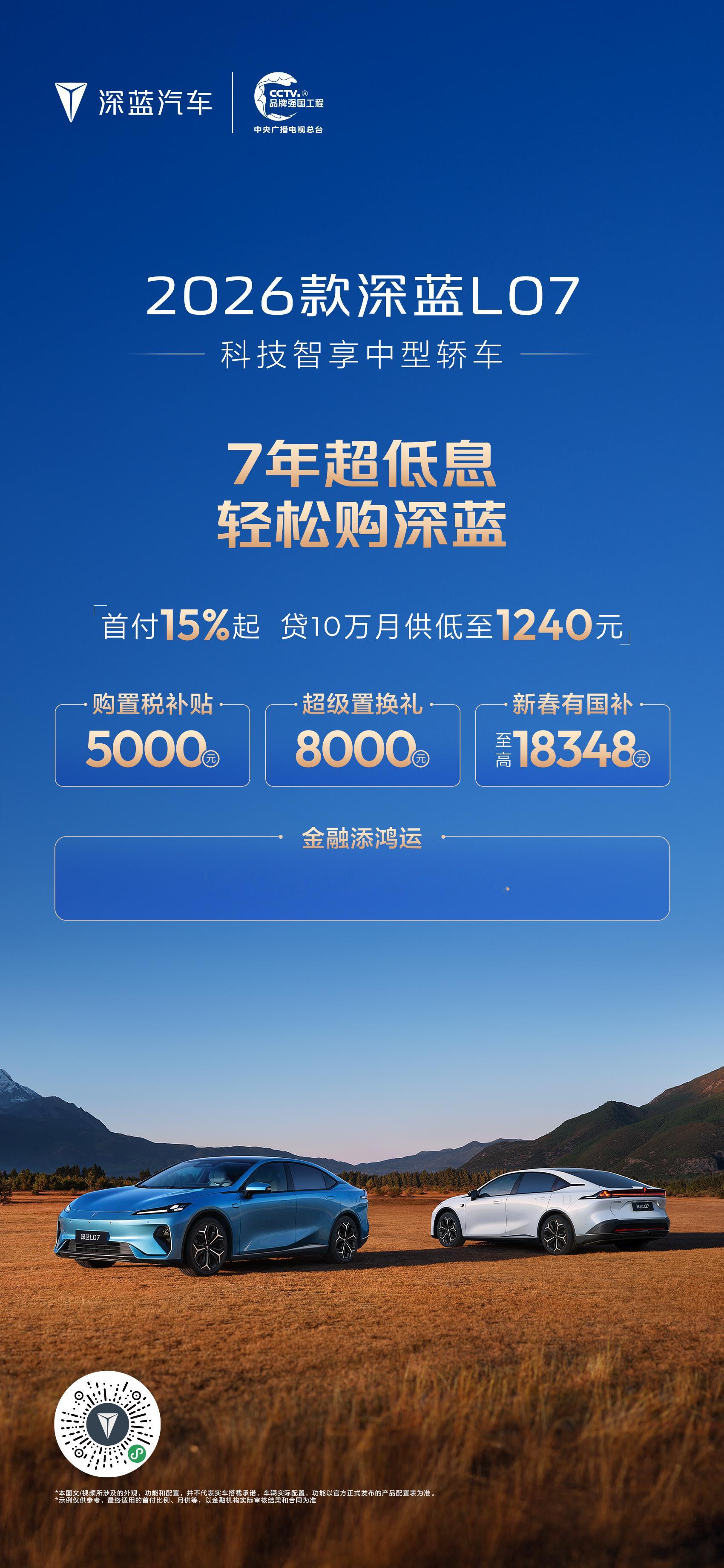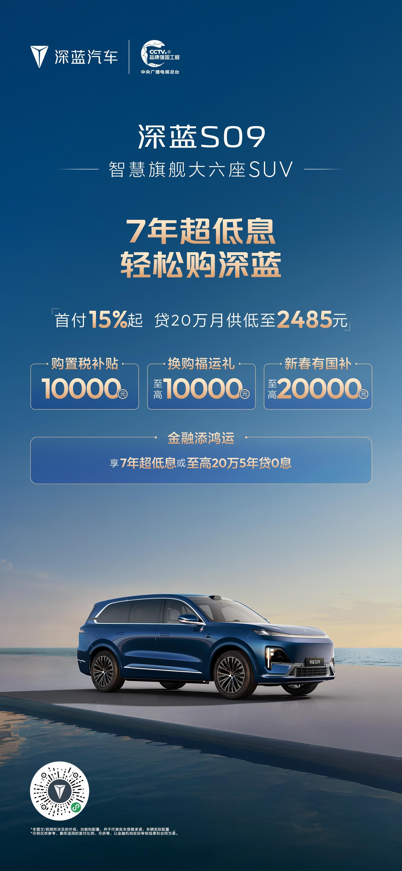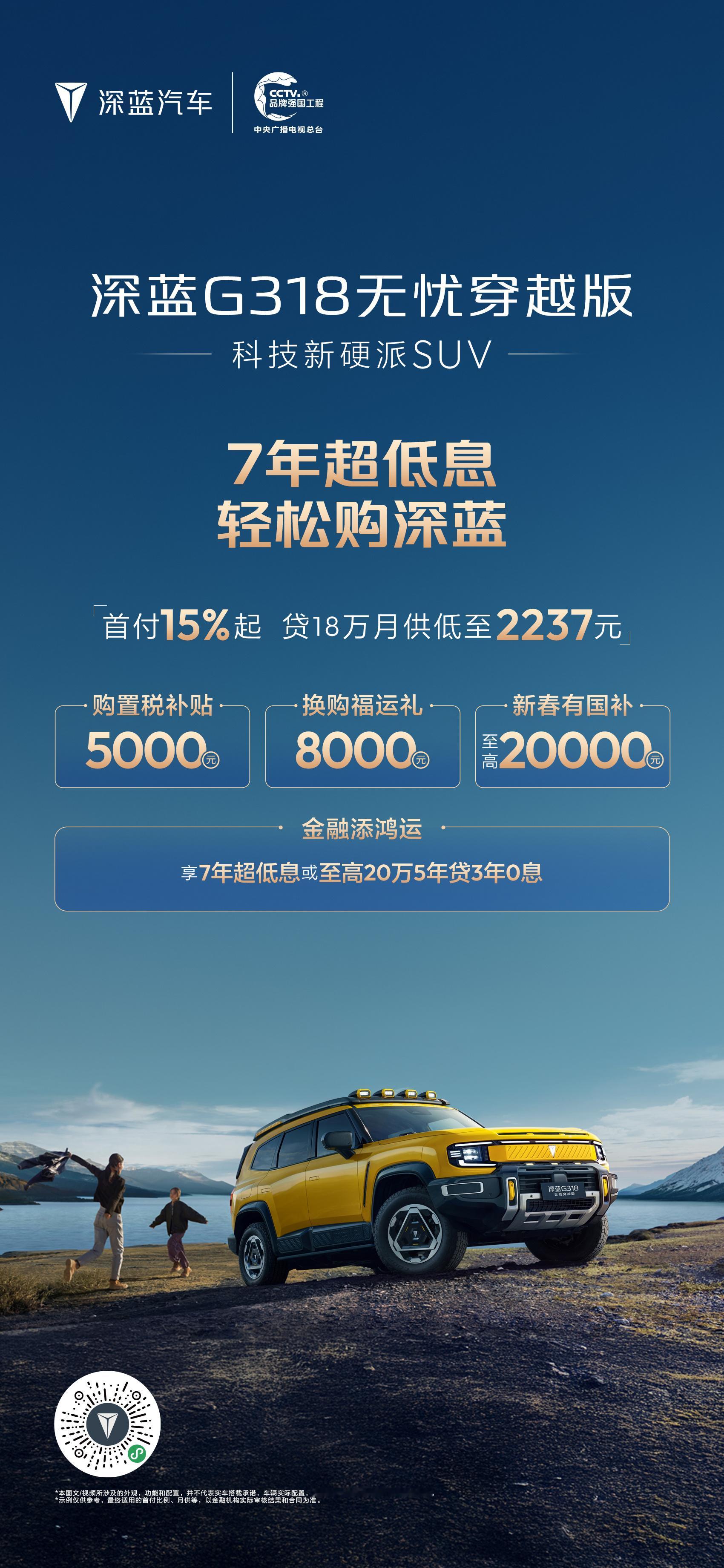 深蓝汽车新春推出“7年超低息 轻松购深蓝”专属金融政策,降低用户购车门槛,助力消费者轻松开起新年旅程。消费者可享“首付15%起月供低至1240元”的7年超低息方案,轻松拥有长续航座驾。同时,活动叠加多重限时礼遇:包括至高10000元购置税补贴、20000元新春国补红包及10000元换购福运礼,以极具诚意的金融方案与全方位补贴,守护每一段安心出行。