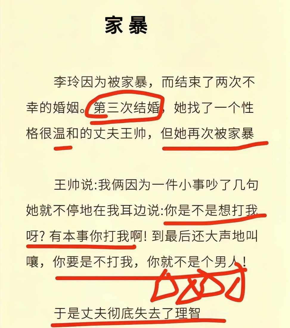 话有多狠,命就有多苦! 李玲因为被家暴,结束了两段不幸的婚姻! 第三次结婚,她千挑万选,找了一个 脾气温和的丈夫结了婚! 结果还是没躲过家暴。 这次家暴的起因,竟是夫妻间一次小争吵。李梅不停地在丈夫耳边激将:“你是不是想打我啊,有本事你打我啊!”甚至大喊:“你要是不打我,你就不是个男人!”最后丈夫失了理智。 我们要明白,言语有时就像带刺的箭,看似能发泄情绪,实则可能伤人伤己。李梅用这样的狠话刺激丈夫,即便对方脾气温和,也难免被激怒。 在亲密关系里,沟通得讲方法,一味地刺激可解决不了问题。大家觉得,在类似情况里,该怎么沟通才好呢?家暴女人离婚
