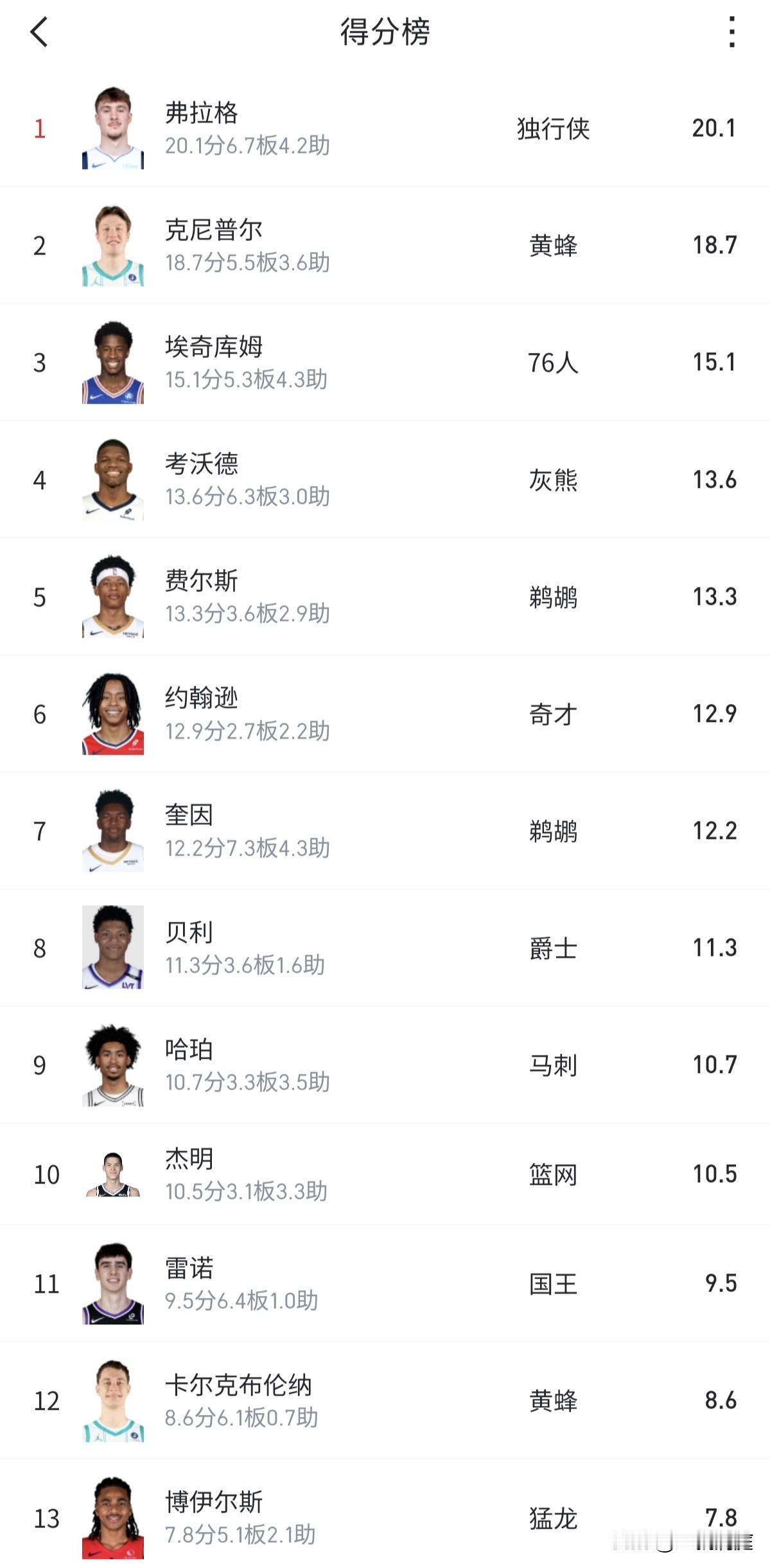 1000分进入倒计时!最多只需要四场比赛弗拉格就可以完成,目前场均20.1分也是本届新秀最高得分,最佳新秀大概率是他了!国王队真的想不通,如今战绩这么差为什么不专心培养雷诺,我感觉也有很大潜力的,你们觉得哪些今后会成为全明星球星呢?