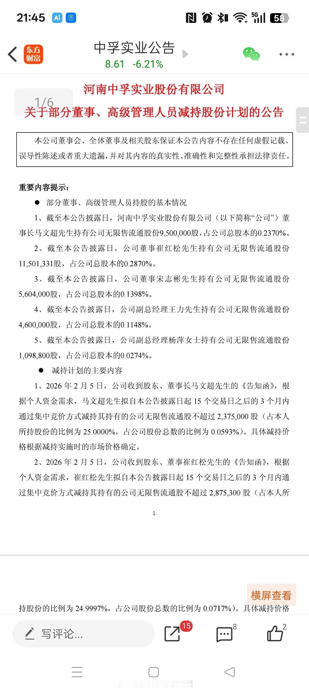 个人入市以来盈利最高的小电解铝刚刚发布几位高管减持公告,合计减持约800万股