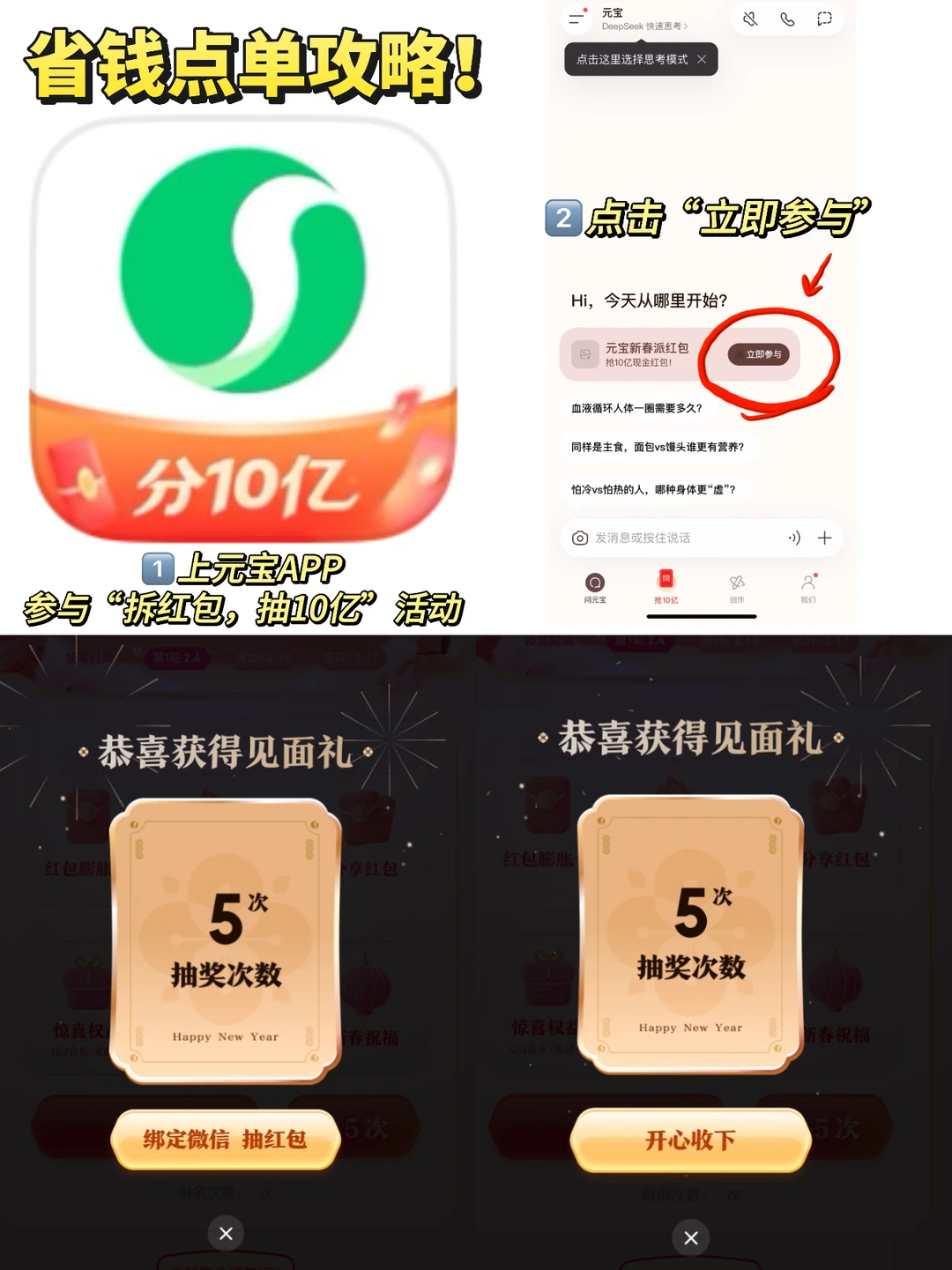 上腾讯元宝APP在首页找到“拆红包,分十亿”入口(记得APP更新到最新版本)