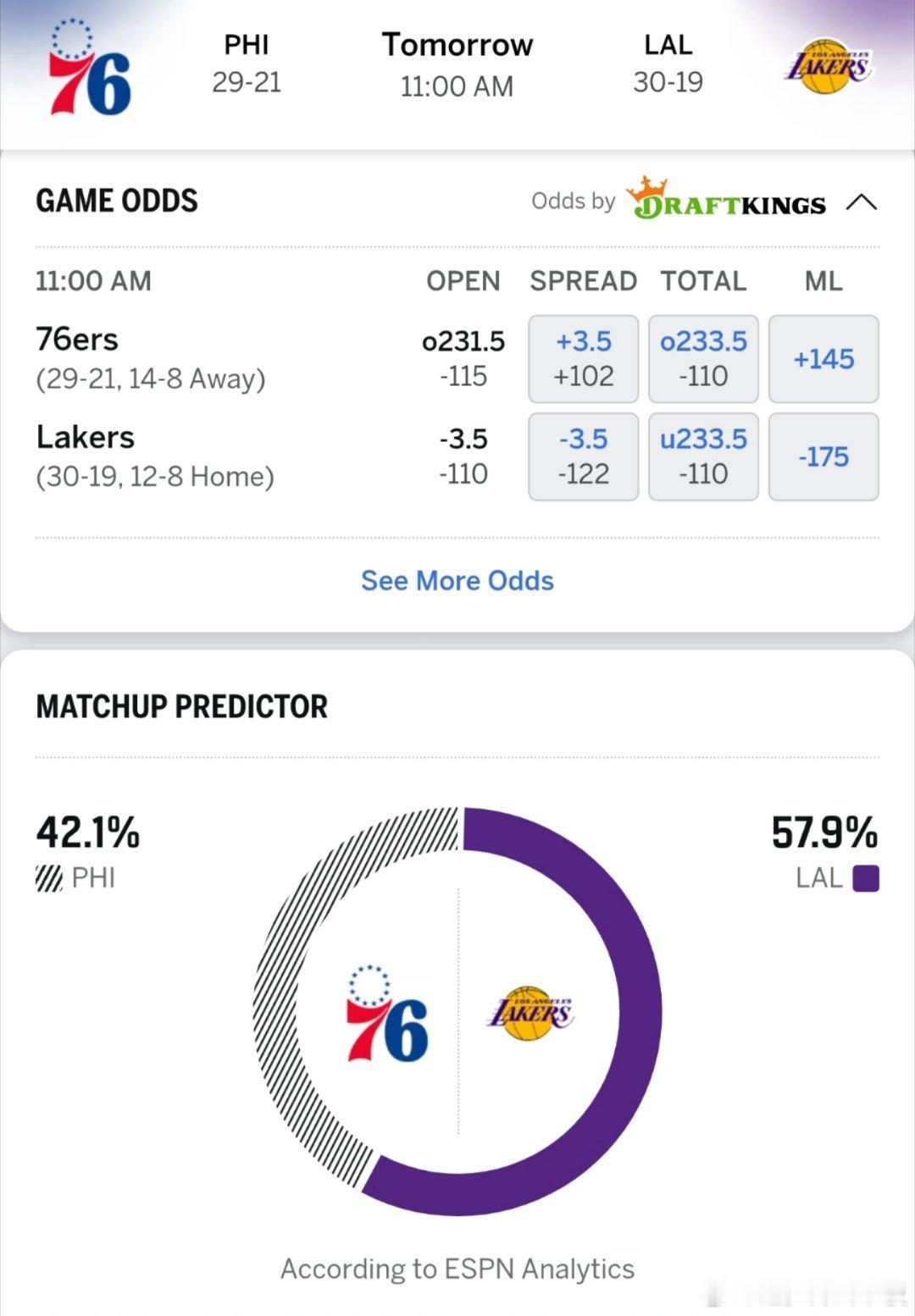 回到加密中心!ESPN预测明日76人vs湖人胜率: 76人42.1%,湖人57.9%,比赛时间中午11点⏰