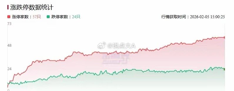 【涨停复盘:今日全市场共57只股涨停,连板股总数10只,大消费板块爆发,横店影视、安记食品涨停!】 2月5日,三大指数午后跌幅收窄,收盘沪指跌0.64%、深成指跌1.44%、创业板指跌1.55%,沪深两市成交额2.18万亿(缩量3048亿)。全市场超3700只个股下跌,不含ST、退市股共44股涨停,连板股10只,封板率81%;焦点股有天地在线14天7板、横店影视6天5板、民爆光电20CM4连板。板块上,大消费、大金融、商业航天、算力租赁等活跃,有色金属、电网设备等跌幅居前。相关热点:AI+零售千问启动30亿春节计划;福建将恢复上海居民赴金门马祖旅游;2026年1月A股新开户491.58万户(环比增89%、同比增213%);中国电信展示量子科技三大赛道成果。详情:涨停复盘:今日全市场共57只股涨停,连板股总数10只,大消费板块爆发,横店影视、安记食品涨停!