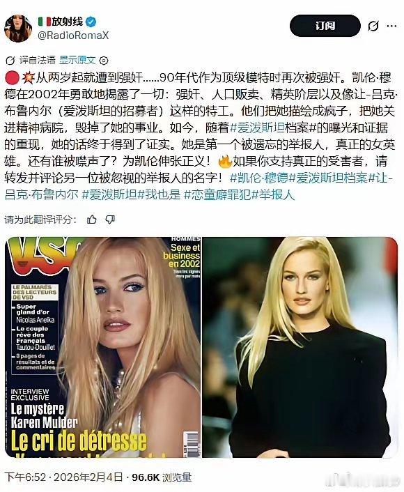 她是荷兰超模凯伦·穆德,早在2002年就敢站出来揭露爱泼斯坦丑闻。敢说真话的代价