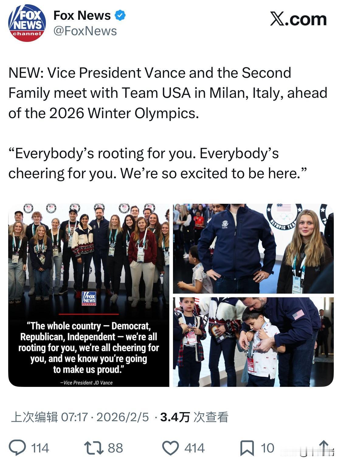 美国副总统詹姆斯·戴维·万斯 (JD Vance) 已于 2026 年 2 月 5 日(周四)抵达意大利米兰。他率领由总统唐纳德·特朗普指派的美国总统代表团,出席即将于 2 月 6 日开幕的 2026 年米兰-科尔蒂纳丹佩佐冬季奥运会。 万斯在米兰马尔彭萨机场附近的欢迎中心会见了美国代表团及参赛运动员。他称赞奥运会是“少数能让整个国家团结起来的事物之一”,并表示无论政治立场如何,全美国都在为运动员加油。 万斯此次由夫人、第二夫人乌莎·万斯 (Usha Vance) 以及他们的三个孩子(Ewan、Vivek 和 Mirabel)陪同。在欢迎活动中,万斯还展示了为儿子 Vivek 准备的奥运证件。 代表团成员还包括国务卿马可·卢比奥 (Marco Rubio) 及其夫人、美国驻意大利大使蒂尔曼·费尔蒂塔 (Tilman Fertitta)。 体育赛事:万斯在抵达当天观看了美国女子冰球队对阵捷克队的预赛。 外交行程:除了出席奥运开幕式,万斯还计划于周五会见意大利总理梅洛尼 (Giorgia Meloni)。在结束意大利行程后,他将访问亚美尼亚和阿塞拜疆,以支持由白宫斡旋的和谈。 此次访问伴随着一些地方性的抗议活动。米兰当地爆发了针对美国移民与海关执法局 (ICE) 执法人员进驻协助奥运安保的抗议,米兰市长朱塞佩·萨拉 (Giuseppe Sala) 也对此表达了反对意见。 2026 年冬奥会的开幕式将于 2 月 6 日在米兰圣西罗球场举行。部分赛事(如冰球和冰壶)已于开幕式前展开。