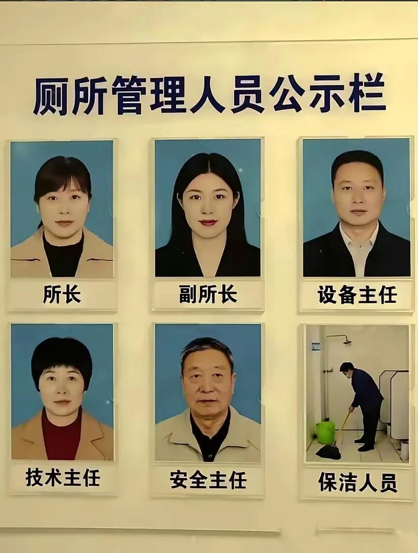 今天看到一个厕所管理人员公示栏,细节拉满!五个管理管着一个保洁员,厕所体系管理精细。一间厕所,居然配备了五位领导,但搞清洁干实事的员工却只有一名,这个估计还的是初级阶段,以后说不定还有工程师、副总工程师,等等,更会完美的!