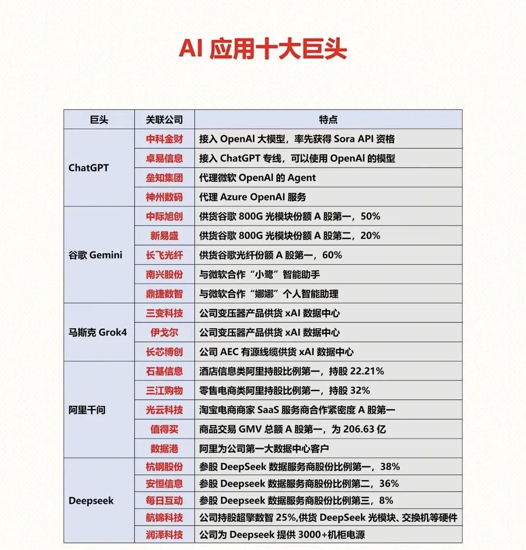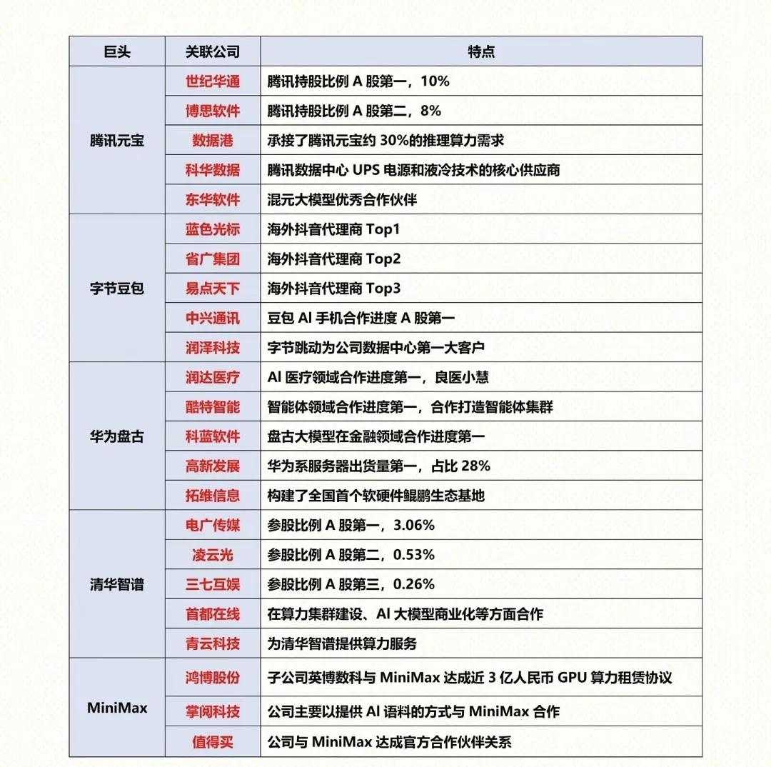 挖到了!AI应用十大巨头概念集合整理!AI巨头背后的财富密码,都藏在这两张表里了! 从腾讯元宝、字节豆包到华为盘古,从 ChatGPT 到 Deepseek,这些巨头背后的关联公司,有的是算力核心供应商,有的拿下独家代理权,有的已深度绑定大模型商业化。两张表帮你理清AI产业链的财富脉络,看懂谁才是真正的潜力股,让你在科技浪潮里快人一步。 字节AI概念:蓝色光标、省广集团、易点天下海外抖音代理前三强,在AI营销时代,将直接承接字节全球化的流量变现需求。 腾讯AI概念:世纪华通、博思软件是腾讯在A股的前两大持股公司。 谷歌AI概念:中际旭创、新易盛是谷歌800G光模块的前两大供应商,全球AI算力升级直接拉动其订单增长。 华为AI概念:润达医疗、酷特智能、科蓝软件分别在AI医疗、智能体、金融领域与盘古大模型深度合作,是华为AI场景落地的“急先锋”。 理财有风险入市需谨慎!
