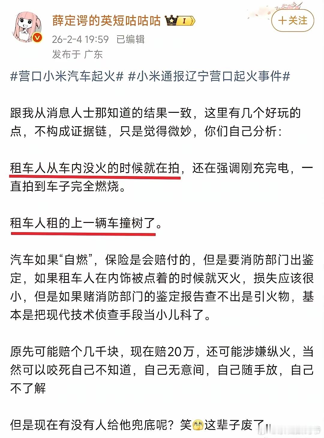 有博主爆料,租车人租的上一辆车也是小米,也出事故,撞树了。然后租这辆小米起火了,从车内没火的时候就开始拍视频。
