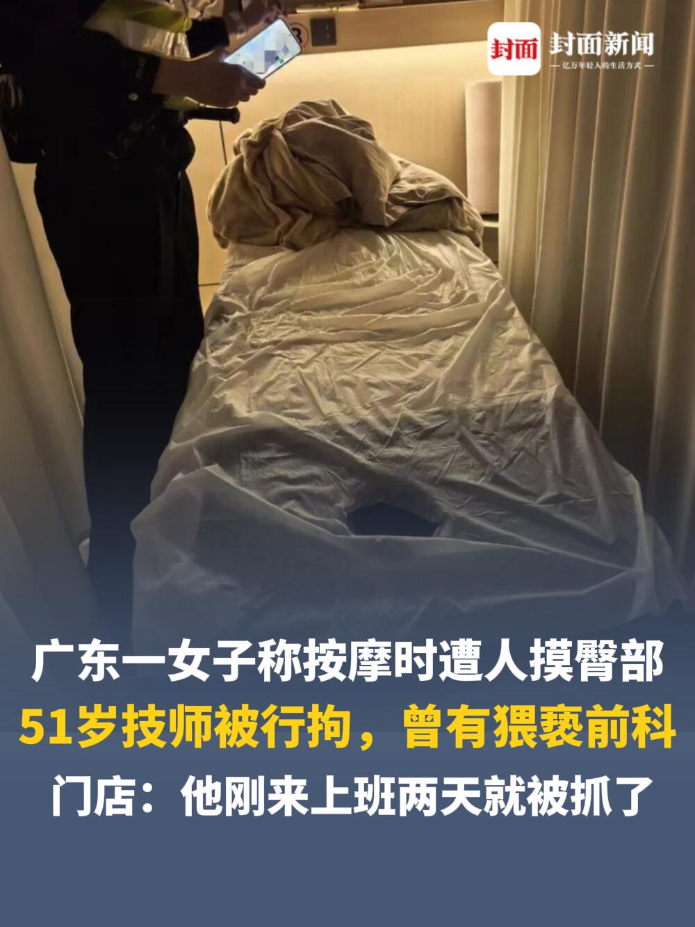 广东广州,一女子去按摩店按摩,谁知,刚躺下不久,就感觉自己的臀部被男技师碰了一下,女子当即就报了警,事后又得知这名技师之前就因这种事被拘留过!然而店家却解释:“他来了不到3天。” 在广州的这个夜晚,本该是一次治愈疲惫的例行公事,最后却变成了一场关于身体边界与信任崩塌的噩梦。 对于常年在写字楼里伏案工作的秦女士来说,腰背酸痛是职场勋章背后的隐疾。作为一家公司的HR,她在年底为了赶进度,连续加班了半个多月。身体发出抗议的时候,她想到了自家小区门口那家熟悉的按摩店。 从今年年初开始,她就是这里的常客。几个月积累下来的消费记录,不仅换来了会员身份,更建立了一种心理上的安全区。在她看来,这是一家有着固定SOP(标准作业程序)的正规门店,是个能让人卸下防备、闭目养神的地方。 那天傍晚,她下班比平时早了一点,没顾上回家就直奔店里。前台的热情一如既往,极力向她推荐一位新来的男技师。 店员的话术很漂亮:“虽然是新来的,但以前在别处干过,是个老手,干活特勤快,手法也不赖。”出于对门店长久以来的信任,秦女士没多想就答应了。 推拿室的灯光通常是昏暗的,这是为了助眠,也为了放松。秦女士趴在按摩床上,随着理疗的推进,原本紧绷的肌肉开始松弛。作为资深会员,她的身体早已熟悉了这套流程:哪里该按,哪里该推,哪个步骤之后是热敷,她心里都有数。 然而,节奏突然乱了。一只手突兀地越过了背部与臀部的分界线。那个触碰不仅毫无理疗逻辑,更带着一种令人毛骨悚然的试探。 那一瞬间,秦女士没有像许多人在极度震惊中陷入僵直或自我怀疑。也许是HR的职业本能让她对“违规操作”有着天然的敏锐度,她非常确定:常规手法里绝对没有这一步。 这不是意外,这是侵犯。她当即报警。没有给店方留任何“私了”的余地,也没有给那名技师解释的机会。 警灯划破了夜色,广州警方的介入迅速且高效。调取监控、核查身份、带离嫌疑人,整个过程如手术刀般精准。监控录像证实了秦女士的指控,那只“越界的手”被电子眼定格为铁证。 处理结果很快下来了:涉事技师刘某,行政拘留7日。但随着警方通报的披露,更让人后背发凉的真相浮出水面。 这个被前台包装成“勤快老手”的刘某,今年51岁,确实是个“老手”,不过是在违法的道路上。早在2023年,他就因为同样的猥亵行为被行政拘留过5日。 从2023年的5天,到如今的7天,这个时间跨度不仅记录了一个惯犯的死性不改,更狠狠抽了商家一记耳光。 当秦女士拿着这个结果去质问店家时,店老板的解释苍白得近乎可笑:“他刚招来,还在试工期,才上班两天,第三天就被抓了,我们也不知情。” “不知情”三个字,此时听起来不像理由,更像是一种可怕的制度性黑洞。 作为HR,秦女士比谁都清楚招聘流程中的红线。一个有类似前科的人,为什么能堂而皇之地进入密闭空间,从事这种需要高度身体接触的服务行业? 答案显而易见:商家为了节省成本或急于用人,省略了最基本的背景调查。那个所谓的“三天试工期”,实际上是把风险转嫁给了顾客。 在这三天里,不明真相的消费者,实际上是在充当这家店的“人肉安检员”。 为了平息事态,店家拿出了惯用的公关手段:道歉,并提出赠送一些免费按摩次数,许诺一定期限内免单。 他们试图用经济补偿来填补信任的裂痕,但这笔账显然算错了。 秦女士拒绝了。她的回击非常理性且坚决:既然你们连招聘审核都不做,谁敢保证下一个技师不是刚从看守所出来的? 经此一事,她明确表示再也不会踏入这家店半步。那种在幽闭空间里对他人的信任感,一旦被打碎,根本无法修复。 这件事在网络上发酵后,舆论场的反应很有意思,像是一面折射社会心态的棱镜。 绝大多数人站在了秦女士这边,感叹“幸亏她懂行且果断”。如果换作一个性格软弱或者对流程不熟悉的顾客,可能在对方“不小心碰到”的辩解下,就含糊过去了。 但也有另一种刺耳的声音出现。有人觉得秦女士“小题大做”,甚至抛出了“老马也有失蹄时”的论调,认为按摩难免会有肢体触碰,不必对一个51岁的打工人赶尽杀绝。 这种论调恰恰忽略了最核心的风险:服务行业,尤其是涉及身体接触的行业,安全边界是底线,不是上限。 把“猥亵惯犯”招进门,这本身就是商家的“重大责任事故”。刘某在2023年没有吸取那5天拘留的教训,到了2024年、2025年甚至现在,他依然管不住自己的手,这说明单纯的惩罚并没有遏制住他的恶念。 而商家那句“才来三天”,暴露的是整个行业在用工安全上的裸奔。 对于秦女士来说,那晚的经历或许会成为很长一段时间的心理阴影。她失去了一个放松的去处,而这家店失去的,则是用无数个“三天”也买不回来的商业信誉。 毕竟,在这个信息透明的时代,没人愿意花钱去一家可能藏着“定时炸弹”的店里,拿自己的身体去赌运气。