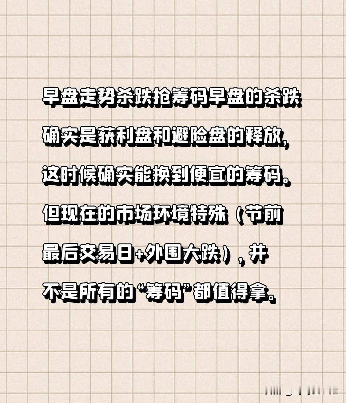 早盘走势杀跌抢筹码 早盘的杀跌确实是获利盘和避险盘的释放,这时候确实能换到便宜的筹码。但现在的市场环境特殊(节前最后交易日+外围大跌),并不是所有的“筹码”都值得拿。 如果早盘出现以下两种情况,你的“杀跌拿筹”策略胜率很高: 急跌无量: 如果指数快速下杀(比如跌破4050点),但成交量没有明显放大,说明是恐慌盘出逃,这时候往往是“黄金坑”。 权重护盘: 观察银行、保险板块。如果它们在跌,但跌幅很小,甚至逆势红盘托底,说明主力在控制节奏,这时候杀跌就是送分题。