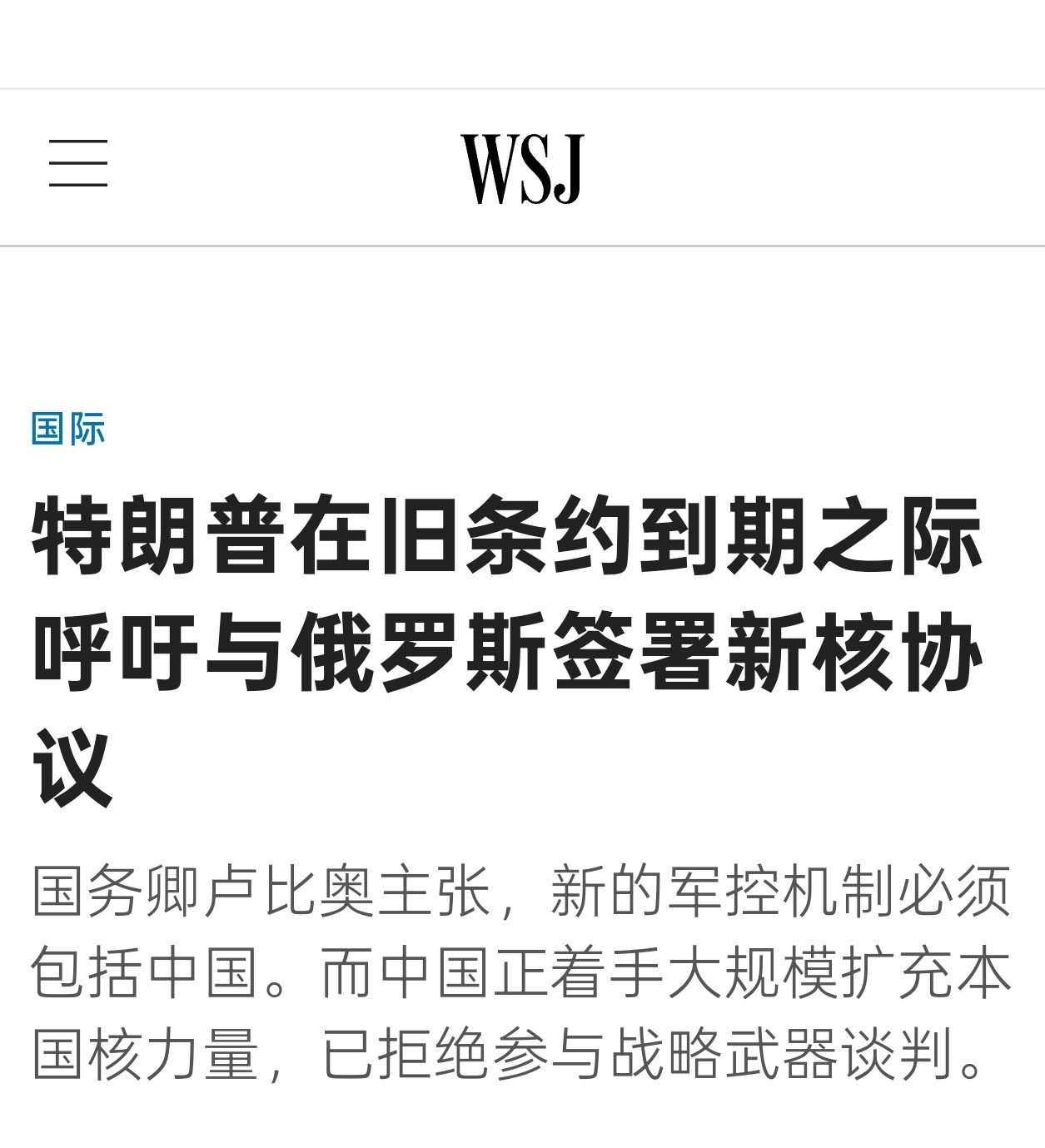 特朗普周四表示,在与莫斯科的最后一项主要核条约失效后,他希望美国谈判一项新的战略武器条约。国务卿卢比奥和众多议员主张,新的军控机制必须包括中国,而中国正着手大规模扩充本国核力量。中国一直坚决拒绝参加战略武器谈判,特朗普在他的社交媒体帖子中没有提到中国。