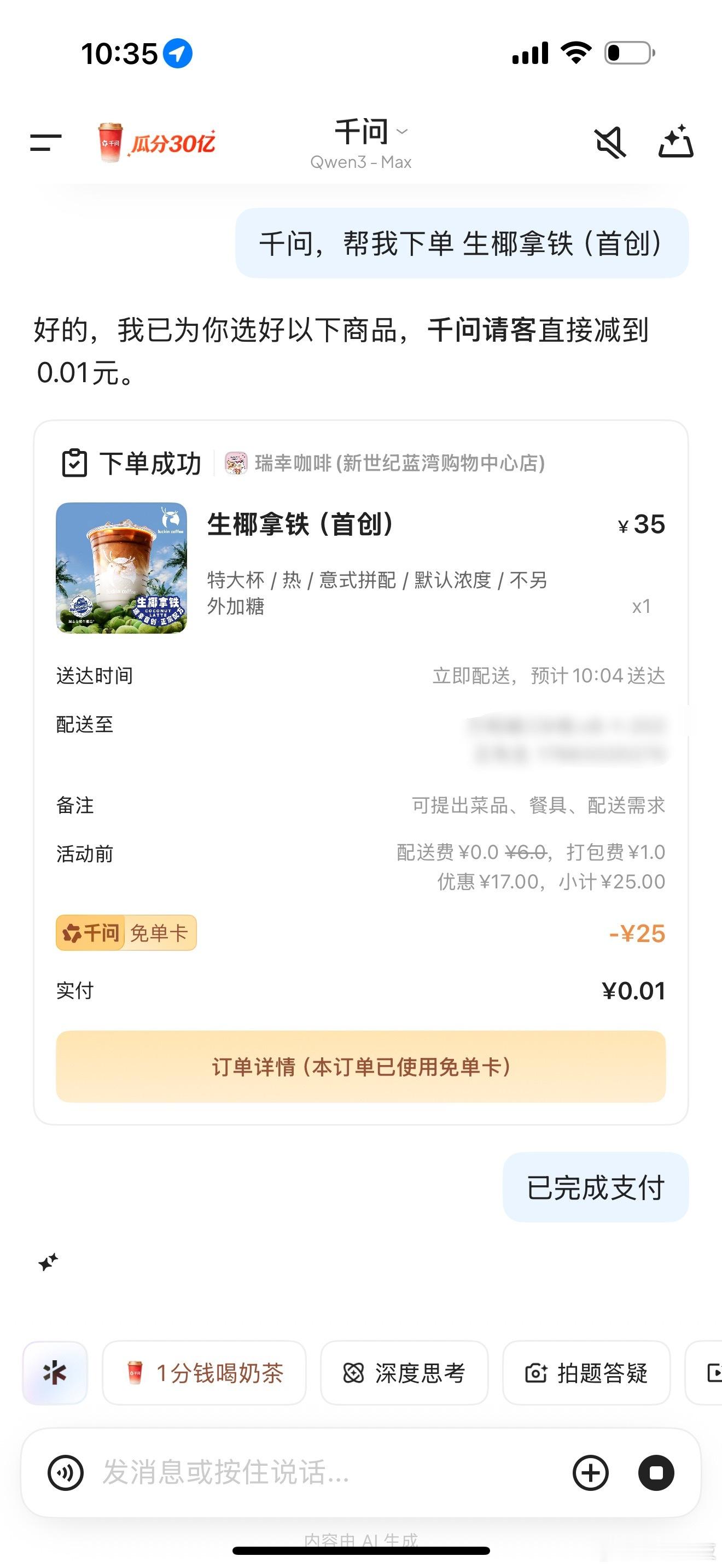 千问狂砸30亿发起奶茶攻势已经点了三杯,太爽了,家里人知道后都在点单,感觉又重现了去年的热闹景象,骑手又忙疯了!感谢千问!!!