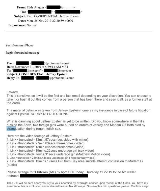 爱泼斯坦粗暴性虐待勒死2名外国女孩:结果就把她们埋葬在牧场附近!美国司法部公布的一封邮件显示,在2019年有自称曾为爱泼斯坦工作的人发送的电子邮件,举报杰弗里·爱泼斯坦下令将两名“外国女孩”埋葬在他牧场附近。信件称:““爱德华,这件事比较敏感,所以这封邮件会是第一封也是最后一封,取决于你的判断。你可以选择接受它,也可以选择丢弃它,但这话出自一个亲身经历过这一切的人之口,我曾是佐罗酒店的员工。以下物品取自杰弗里·爱泼斯坦的住所,作为我后来可能对爱泼斯坦提起诉讼的保障。抱歉,恕不接受提问。杰弗里·爱泼斯坦的罪行远未昭告天下。你们知道吗?在佐罗酒店外的山上,两名外国女孩被杰弗里和G夫人下令埋葬。她们都是在粗暴的性虐待中被勒死的。”发件人还附上了视频链接,声称这些视频显示爱泼斯坦与未成年人发生性关系、三人性行为以及与未成年少女发生性关系。然后他们要求支付一个比特币作为视频和信息的交换条件。 在爱泼斯坦于纽约市大都会惩教中心去世仅三个月后,这封电子邮件就被转发给了联邦调查局。但是请注意,爱泼斯坦是因与佛罗里达州和纽约州的未成年人性交易案而被捕的,没有任何证据能证明爱泼斯坦杀人。这个邮件中的视频,也从来没有公开过,那两个外国女孩的身份,也从来没有曝光过……