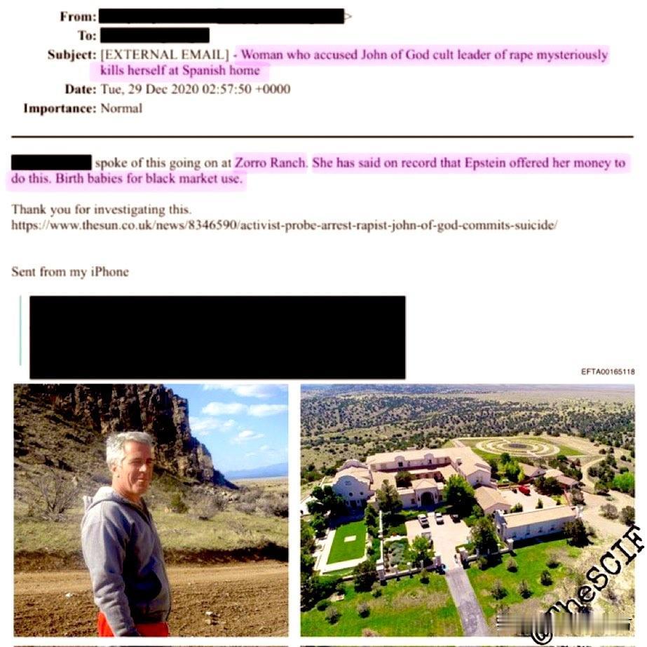 今日俄罗斯报道:爱泼斯坦档案显示,一名女子曾公开表示,爱泼斯坦曾给她钱让她生孩子。 “上帝之子”爱泼斯坦将妇女儿童囚禁在名为“佐罗牧场”的地下巢穴中。 一旦她们无法生育,就会被“清除”。