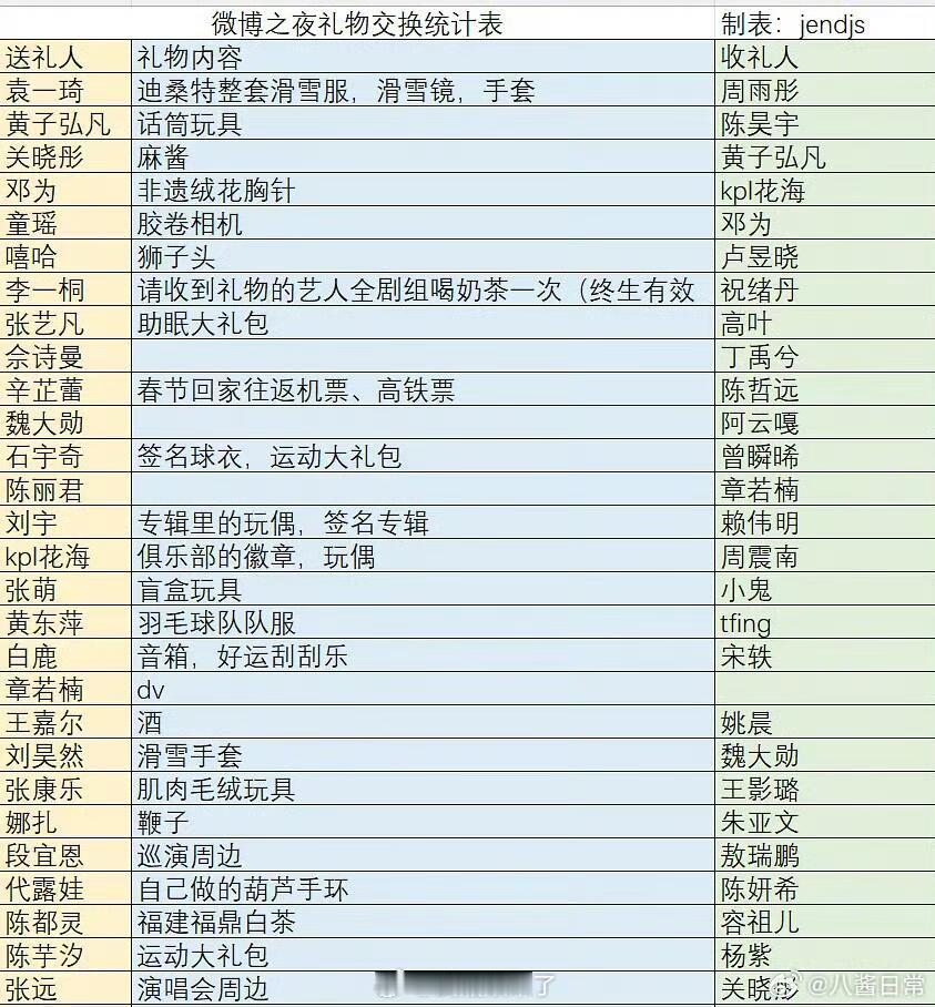 微博之夜交换礼物统计表大家最喜欢谁的礼物