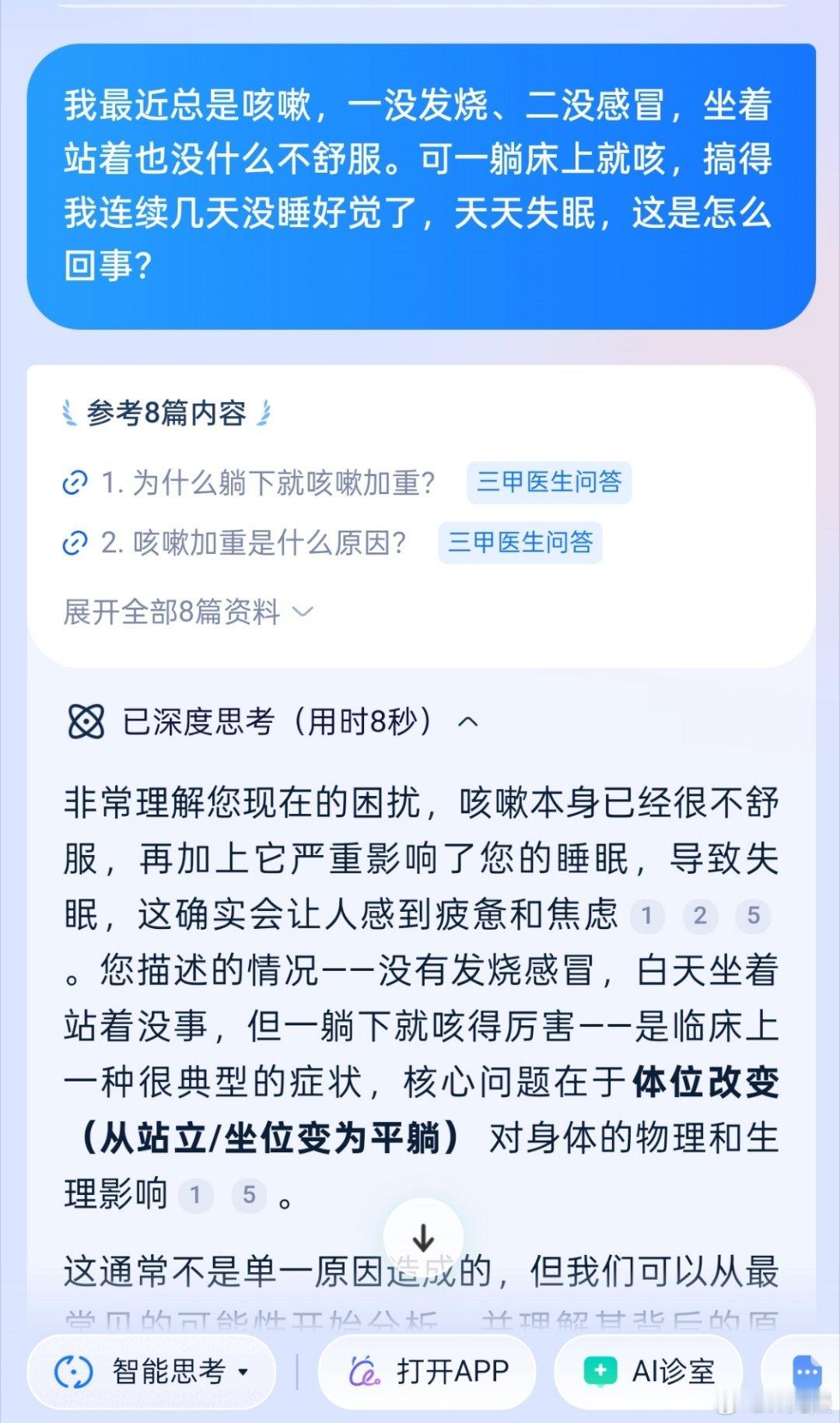 问了阿福,它分析可能是体位变化、冷空气的问题,还追问了作息饮食,最后给了垫高床头、调整晚餐的实用性建议。