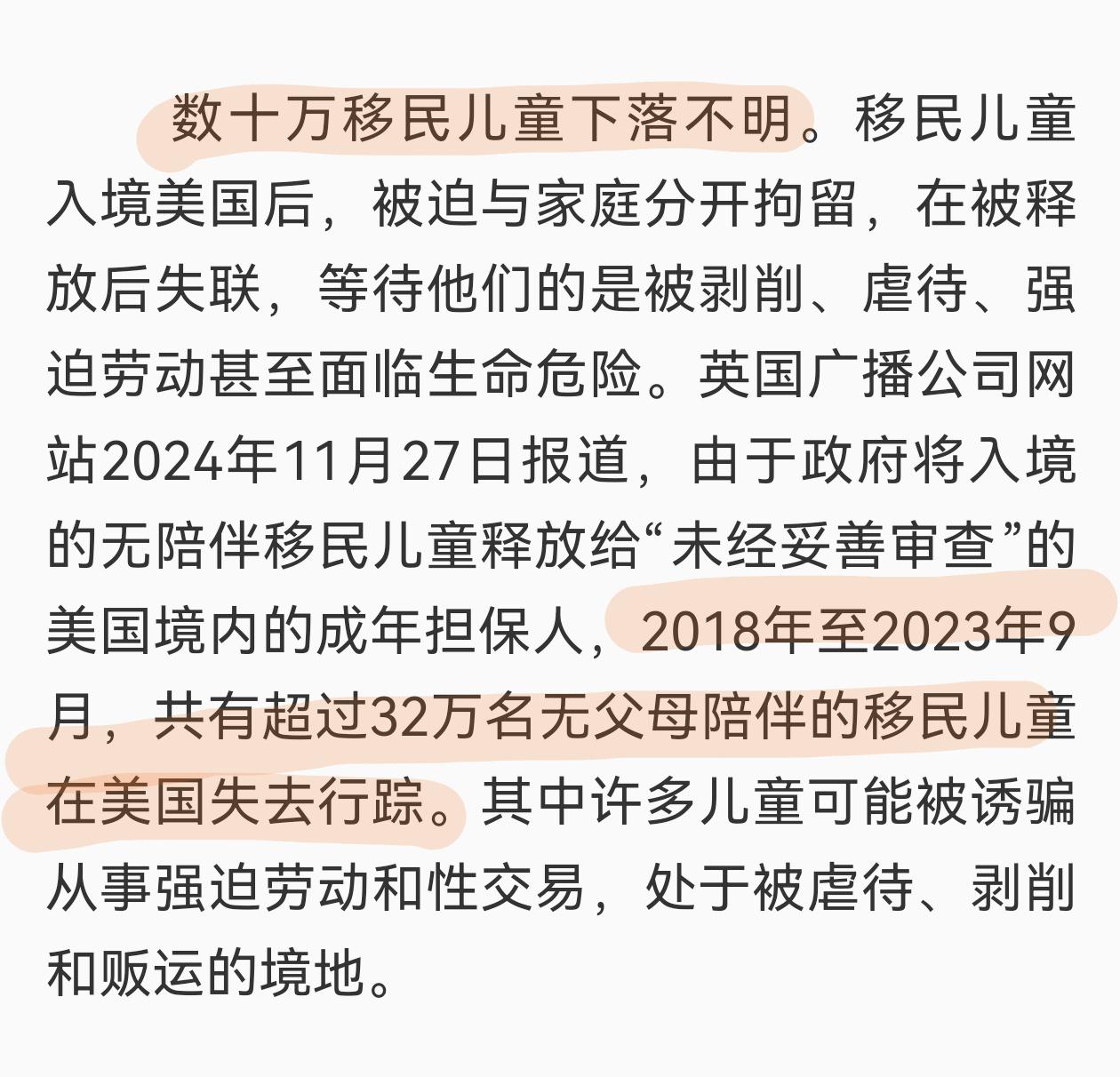 也不知道收养了多少。按道理,这些孩子是华人,长大了之后,总会有一部分人会有声音的,现在什么消息都没有。 想想现在这个现状,对他/她们的经历有点绝望。 英国广播公司网站2024年曾报道,2018年至2023年9月,共有超过32万名无父母陪伴的移民儿童在美国失去行踪。 其中许多儿童可能被诱骗从事强迫劳动和性交易,处于被虐待、剥削和贩运的境地。 正因如此,中国不再允许外国家庭收养中国儿童,只能说国家太英明了。