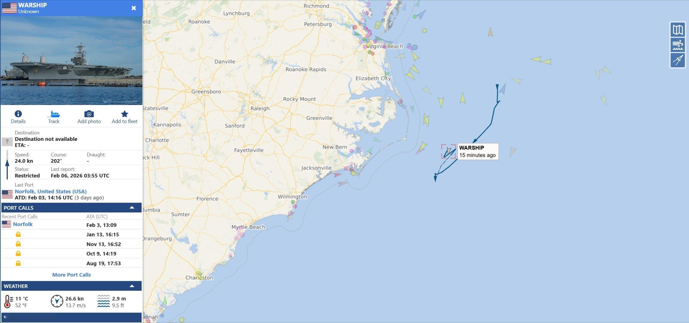 AIS信号显示,2月6号,美国海军布什号航母(CVN-77)仍位于美国东海岸附近活动。美国航母动态伊朗