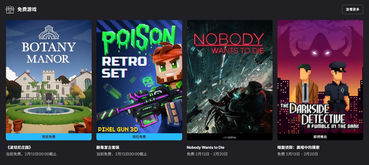 【隔壁喜加二】《波坦尼庄园》和《Pixel Gun 3D》DLC「剧毒复古套装」在Epic游戏商城开启免费领取,2月13日0点截止,总价170元,其中「剧毒复古套装」支持中文。下周免费游戏为《无人愿死》和《暗面侦探:黑暗中的摸索》。epic喜加一