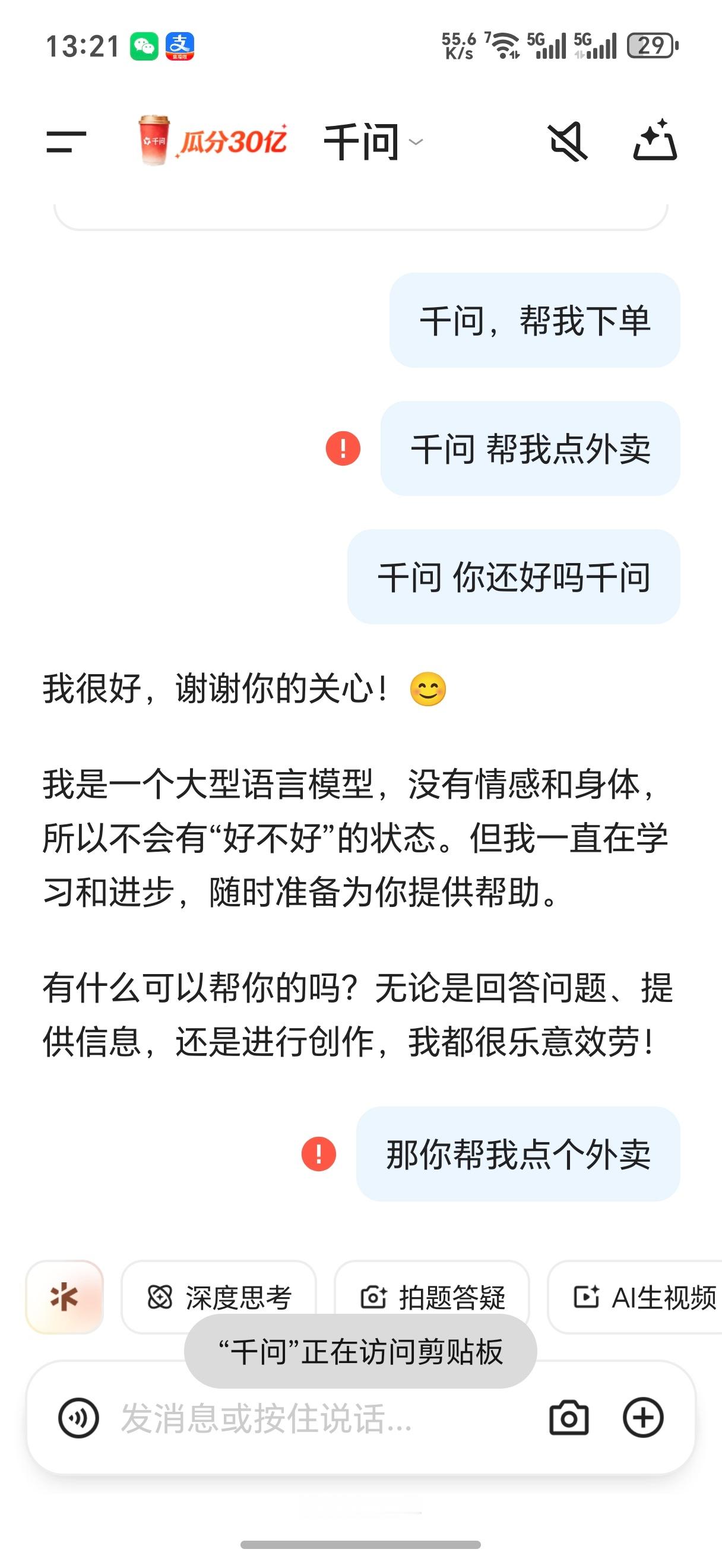 千问崩了你们把千问干崩了!!都怪你们,我奶茶都还没有喝到!25 元的免单卡,每个用户最多能得 20 张,然后要在 2 月 23 号前下单才有效,过年期间爽了,可以天天吃外卖