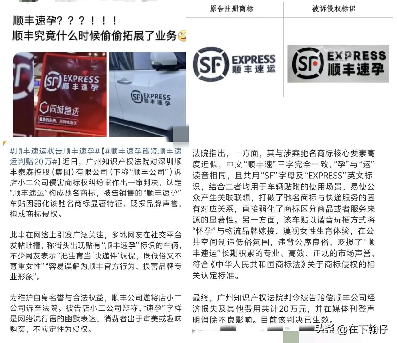 广州知识产权法院近日对一起恶意“玩梗”的商标侵权案作出生效判决:因销售“顺丰速孕”车贴碰瓷驰名商标“顺丰速运”,商家店小二公司被判赔偿20万元并公开道歉,引发社会对低俗营销与商标保护的热议。 ​ 这个案子确实是商标侵权和低俗营销的一个典型反面教材,“顺丰速运”是众所周知的驰名商标,享有很高的法律保护强度。“顺丰速孕”在发音、文字构成上刻意模仿,借助其知名度吸引眼球,属于典型的“傍名牌”行为,极易导致公众混淆或产生不当联想,认为两者存在关联。 中国文化博大精深,“顺丰速孕”这名字起的,是不是有点不尊重人了,难怪被起诉! ​强行碰瓷顺丰速运,把生育当‘快递件’调侃,既低俗又不尊重女性,很容易被误解为顺丰快递官方行为。 它是一次对 “商业创意”与“法律侵权” 、 “幽默表达”与“低俗冒犯” 之间界限的清晰界定。商家想吸引注意力无可厚非,但必须建立在尊重法律、尊重他人知识产权、尊重公序良俗的基础上。